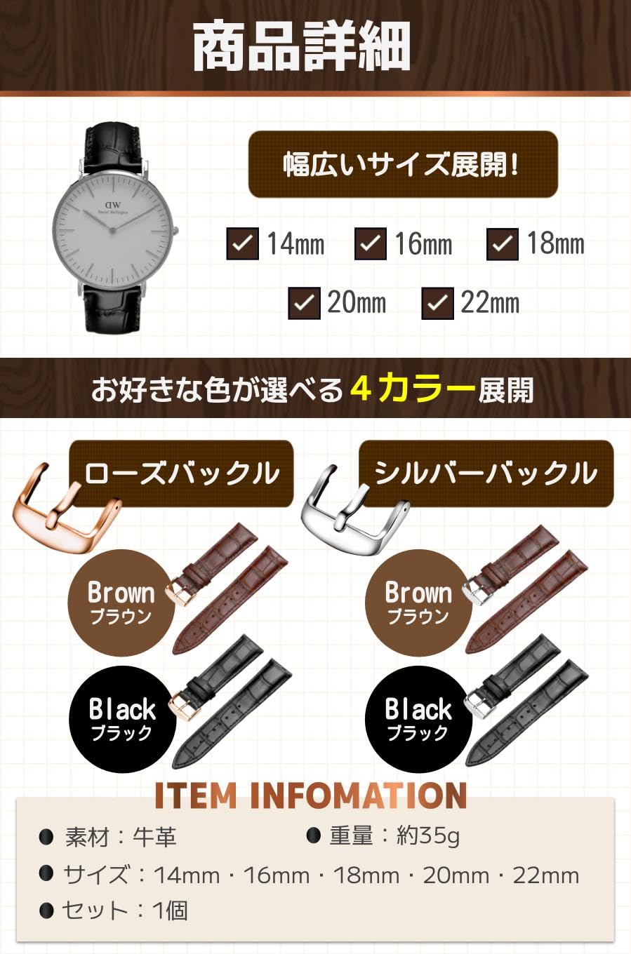 【商品特徴】①高級感のある牛革:上質な牛革素材で高級感を演出!/②選べる対応サイズ:お使いの時計に合うサイズが見つかる/③男女兼用のデザイン:シンプルなデザインなので合わせやすい/④優れた耐久性:高い耐久性で長く使用することが可能