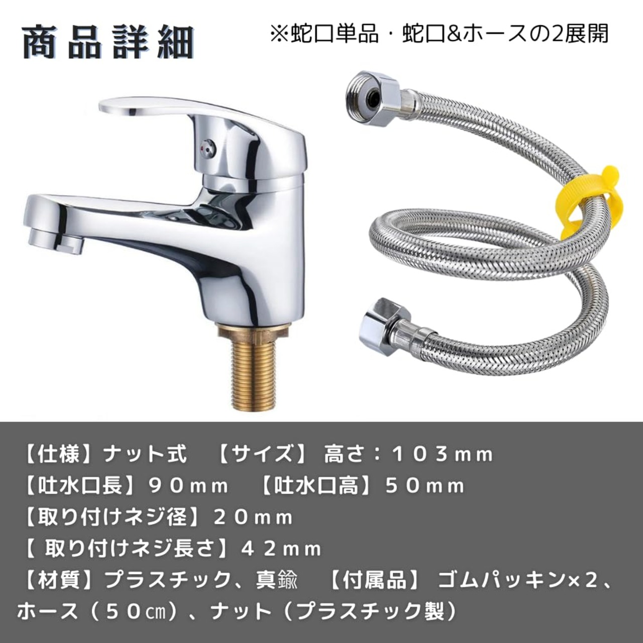 付属品: ゴムパッキン×2、ホース(50㎝)※ホースセットにのみ付属、ナット(プラスチック製)
