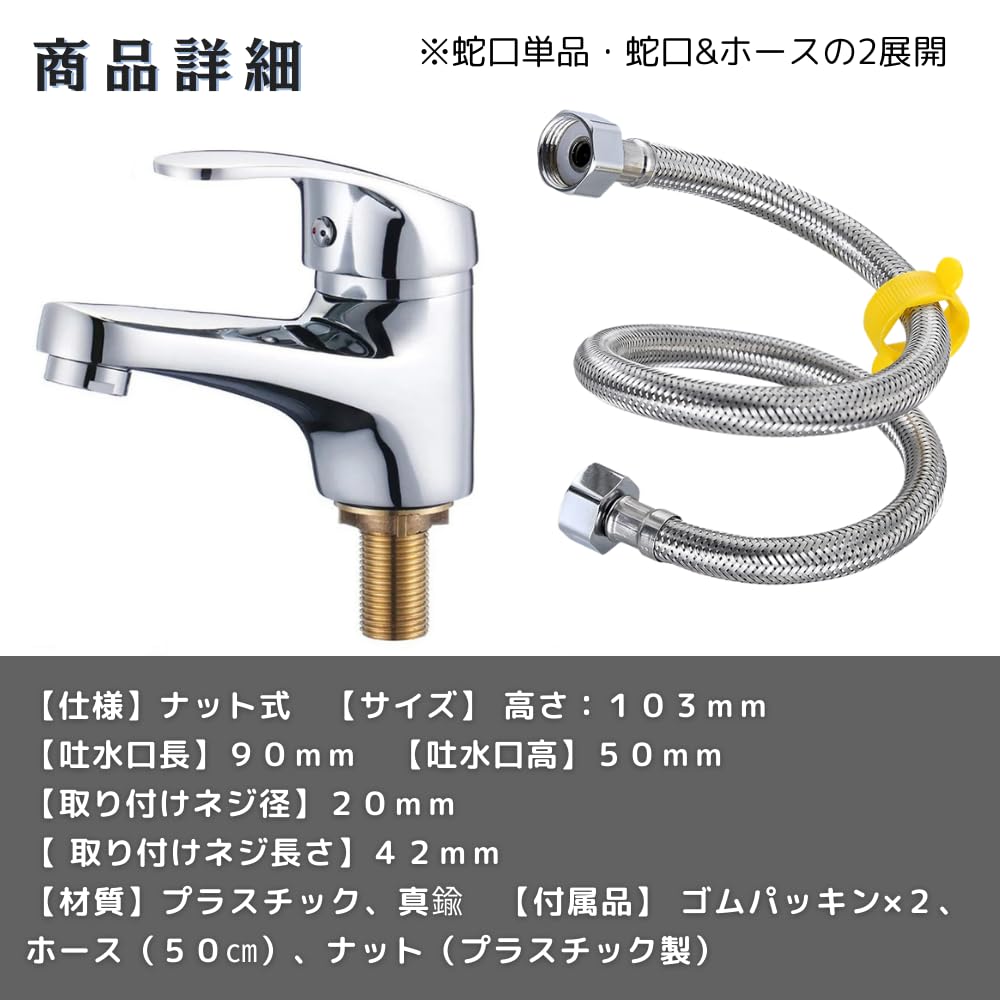 【商品仕様】仕様: ナット式 / サイズ: 高さ:103mm / 吐水口長:90mm / 吐水口高:50mm / 取り付けネジ径:20mm / 取り付けネジ長さ:42mm / 材質: プラスチック、真鍮 / 付属品: ゴムパッキン×2、ホース(50㎝)、ナット(プラスチック製)