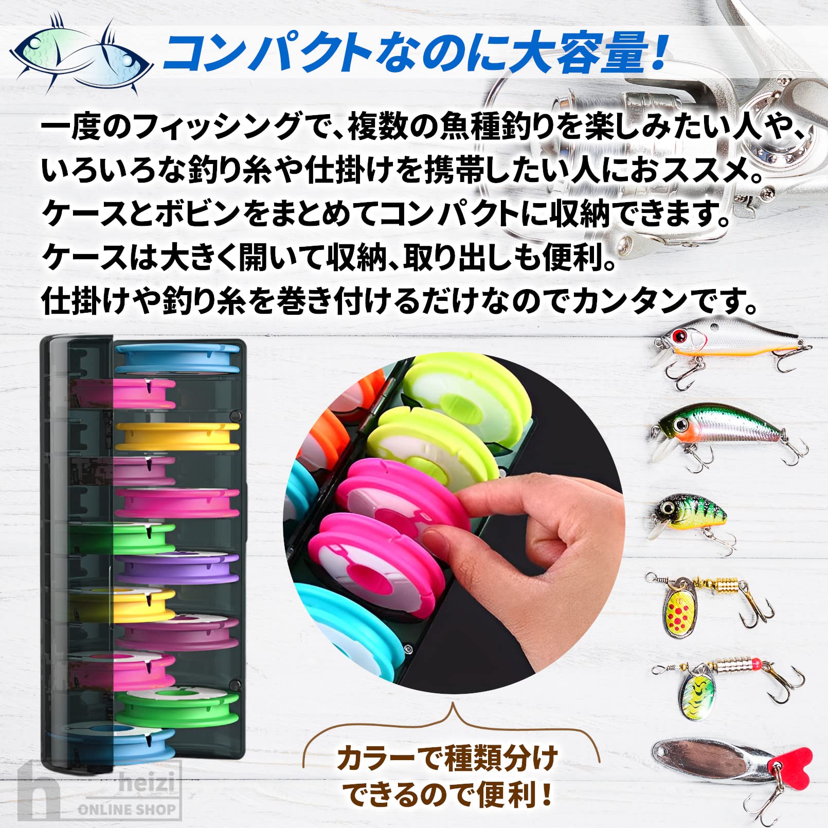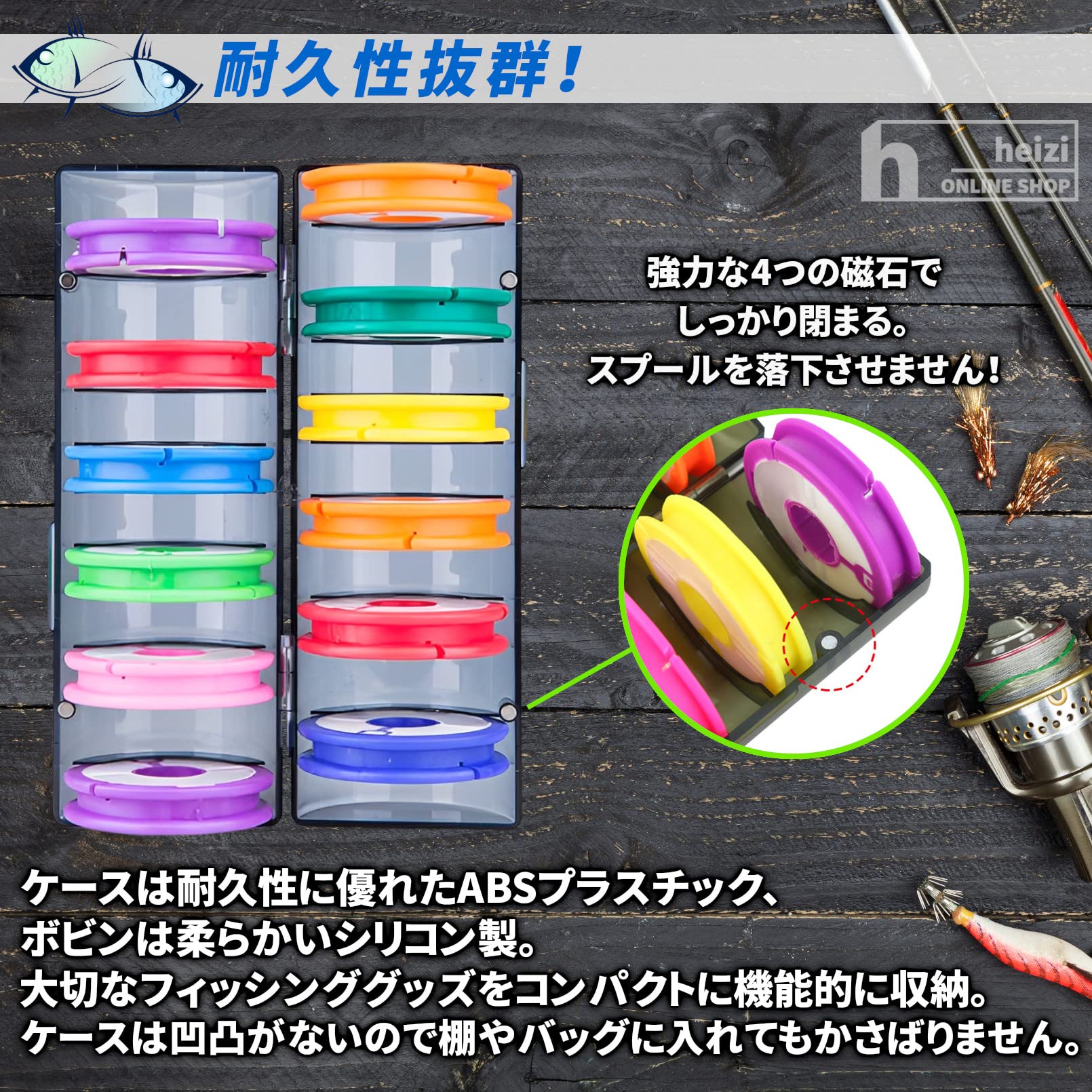仕掛け釣り糸収納は、ケースは耐久性に優れたABSプラスチック、ボビンは柔らかいシリコン製。大切なフィッシンググッズをコンパクトに機能的に収納。ケースは凹凸がないので棚やバッグに入れてもかさばりません。