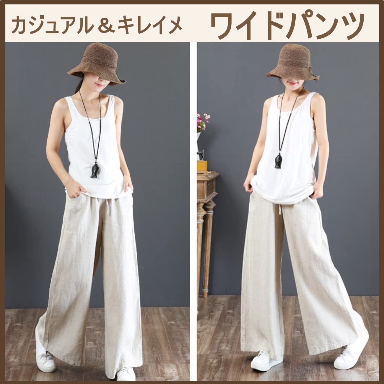 華奢なキレイめトップスと合わせて季節感のある大人スタイルにキレイでもカジュアルでも使えるワイドパンツ。