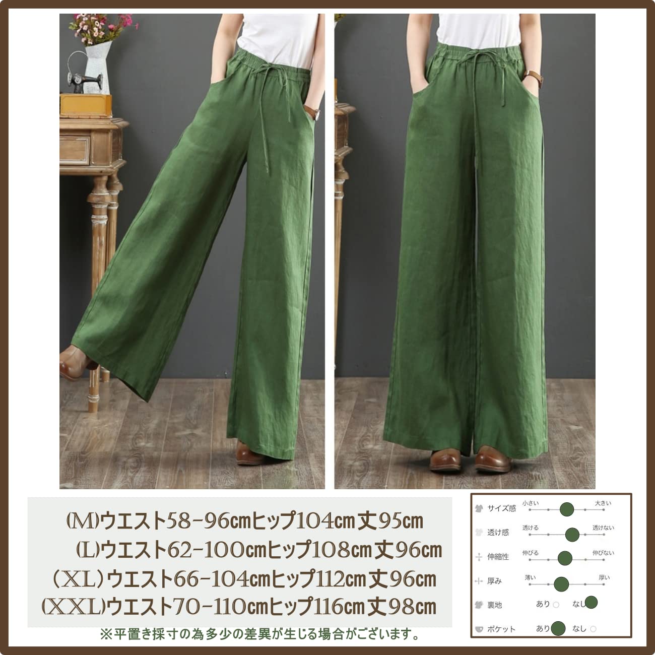 嬉しいウエストゴム!女性らしいニュアンスに仕上がる1本です。ウエスト部分は楽ちんゴム&ヒモのダブル調節OK♪