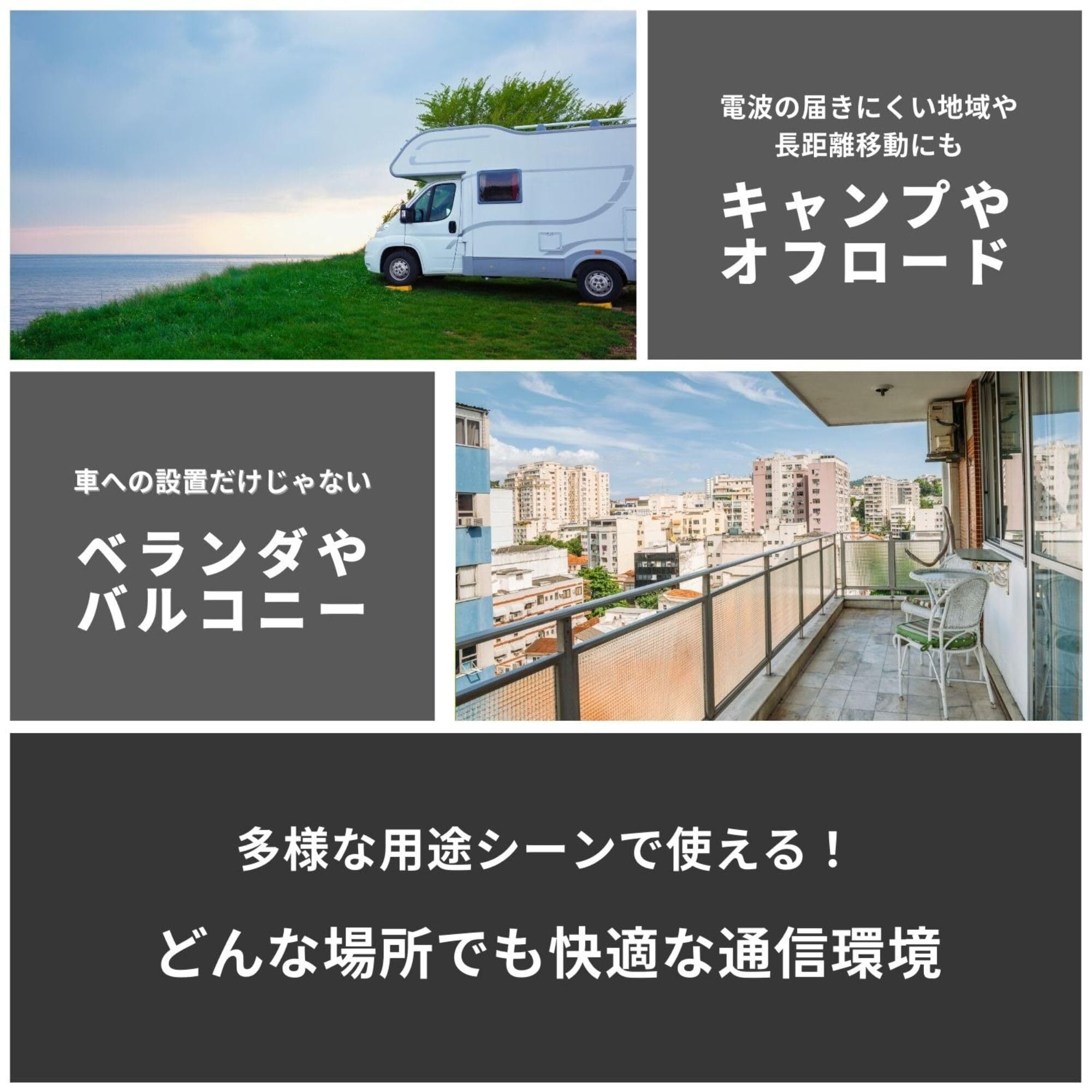 多彩な設置場所に対応。このアンテナ基台は様々な場所に簡単にアンテナを取り付けることができます。車載用アンテナの取り付けにはもちろんベランダやバルコニーなど自宅でもお使いいただけます。