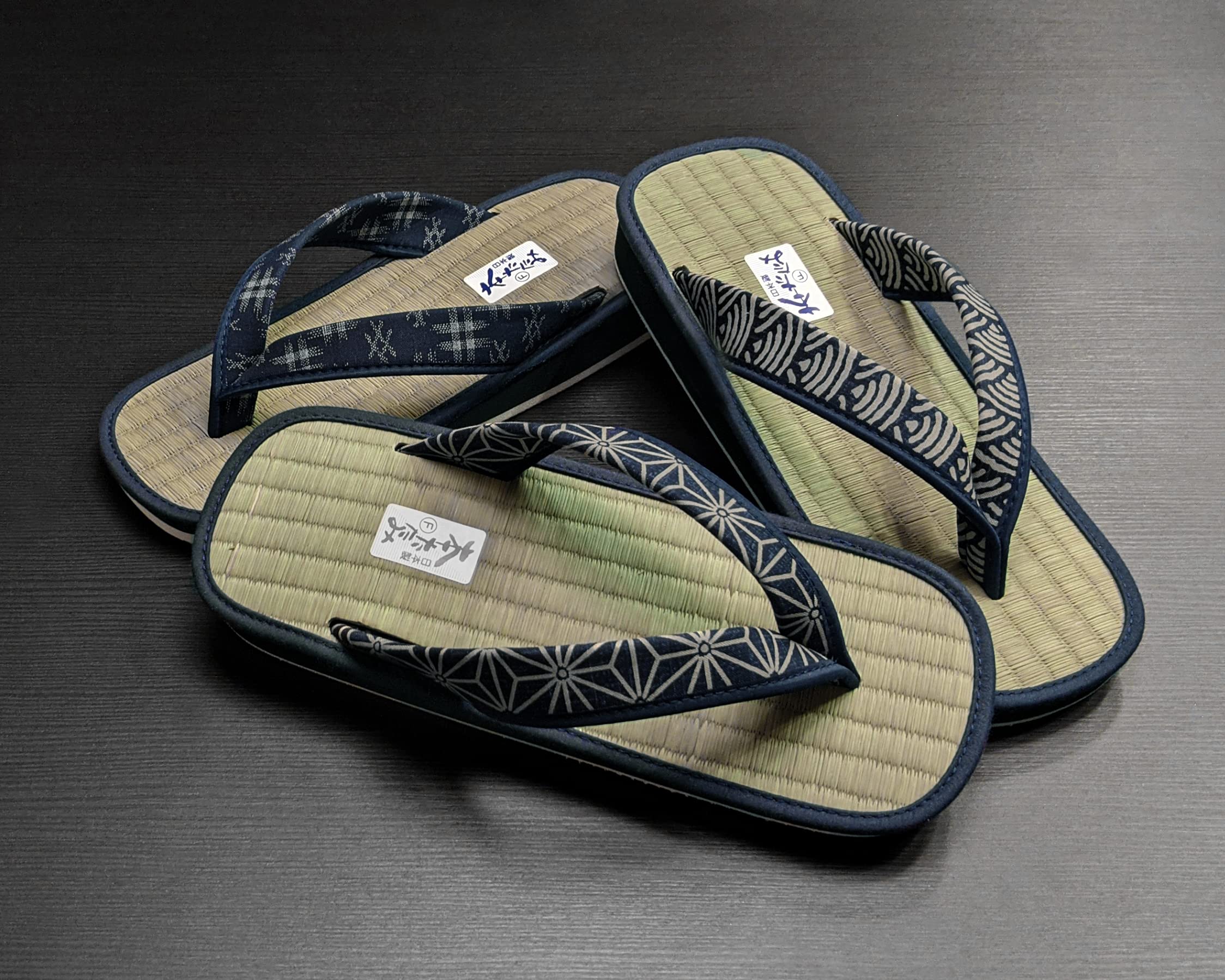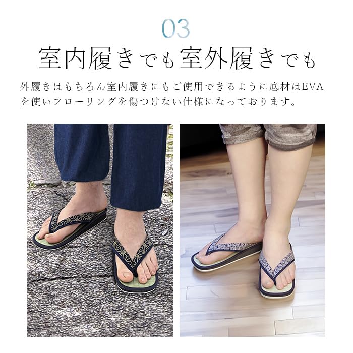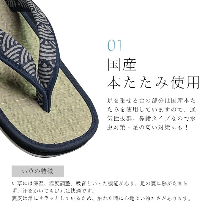 材質 鼻緒:綿、ナイロン 天板:国産い草、プレスボード、底材/EVA 適応サイズ:フリーサイズ(〜28cm) カラー:麻の葉、青海波(せいがいは)、井げた