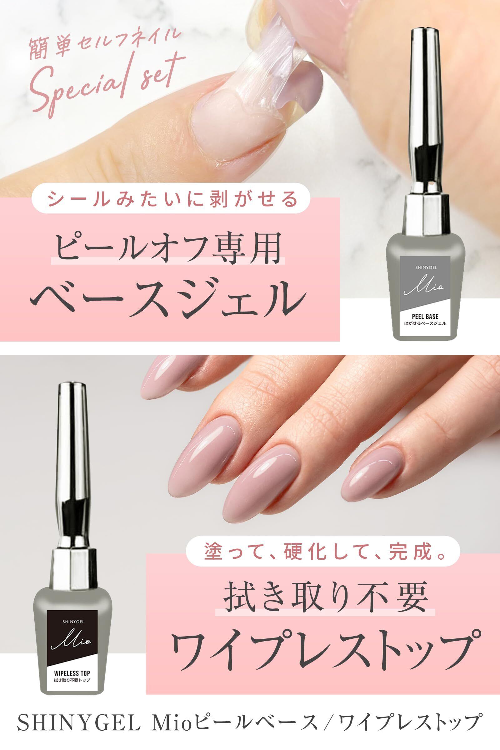 SHINYGEL Mio シャイニージェル ミオ 【ピールベース+ワイプレストップ】<剥がせるベースジェル> 日本製 ジェルネイル 爪にやさしい[UV/LED対応]ピールオフベース ピールオフタイプ ペロリンと剥がせるジェルネイル リムーバー不要 はがせるジェルネイル 簡単オフ (ベース+トップセット, 各5g)