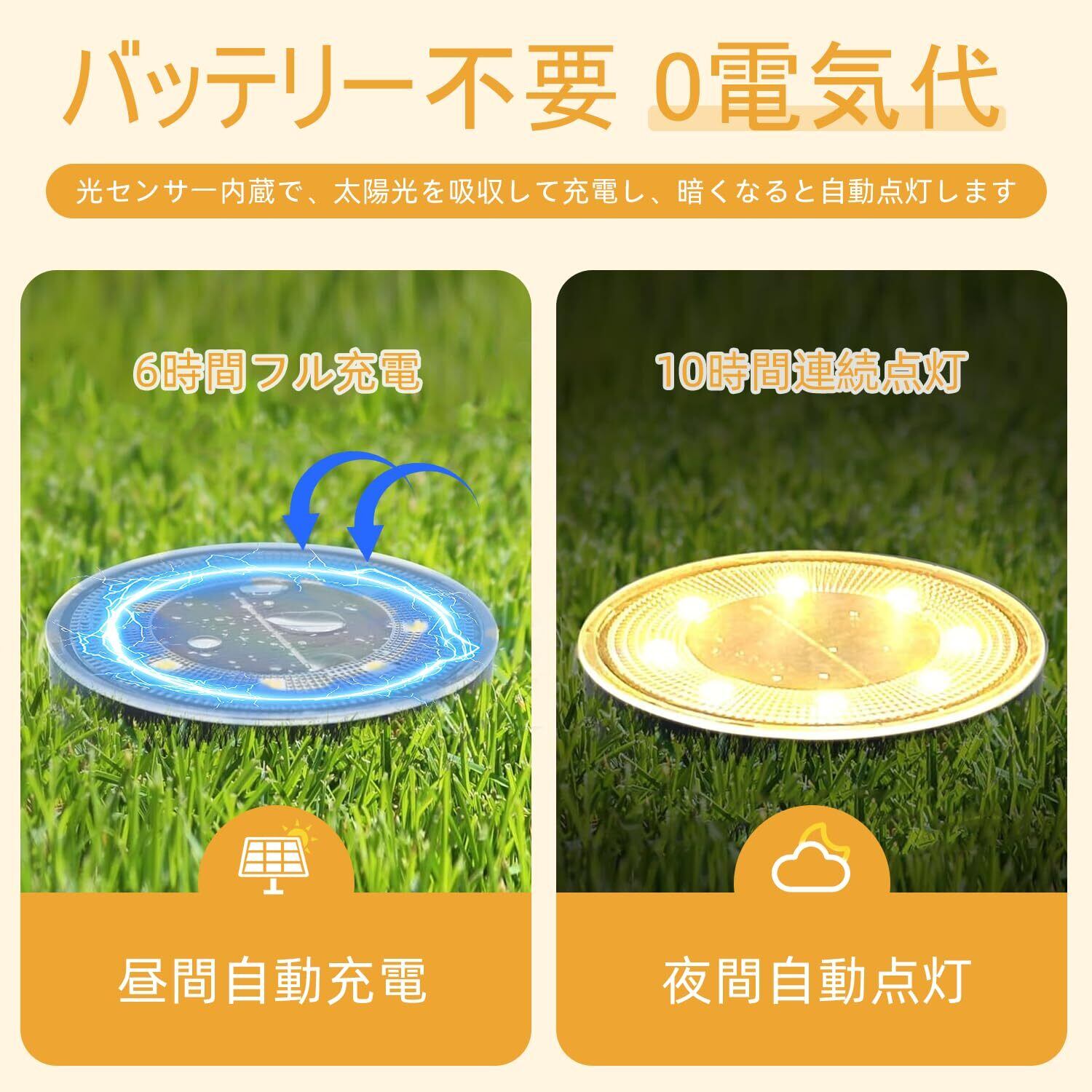 自動点灯と光センサー機能:このソーラーライトには光センサーが内蔵されており、日暮れとともに自動で点灯します。逆に明るくなると自動で消灯するため、手間いらずで使うことができます。日当たりの良い場所でのフル充電には約6時間、フル充電で8 ~ 10時間程度点灯し続けることができます