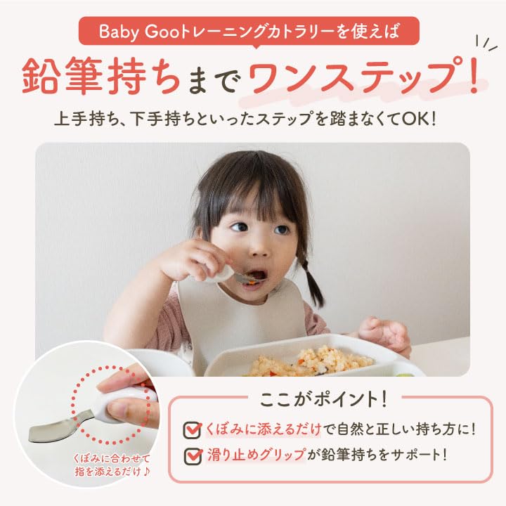【人間工学に基づいたデザイン】 ひっくりかえらないベビー食器でおなじみのBabyGooがベビー 用の フォーク スプーン を独自開発。 赤ちゃんが本当に使いやすい形を徹底的に追及し、人間工学に基づいて設計されています。 【モンテッソーリ保育士が推薦】 子どもの自発的な学び・活動をサポートするモンテッソーリ教育の専門保育士が推薦。 細部までこだわったデザインが 離乳食 が始まった赤ちゃんの成長意欲を促します。 【日本人の幼児向けに独自開発】 国内ベビー食器メーカーが日本人の幼児向けに独自設計。 手元は持ちやすい大きさで滑り止めのグリップ付き。 先端部分は1歳~3歳のお口サイズに合わせた“ちょうどよいサイズ感”に。 【食べやすいからお食事がどんどん楽しくなる】 フォーク先端は凸凹のデザインで麺類や果物類などが滑り落ちない設計になっています。 また、スプーン先端は平らになっているので、お皿の隅まですくいやすい設計になっています。 お子様に“できる喜び”を体験してもらいやすい独自デザインが完成しました。 【安全性もOK!安心素材使用】 フタル酸不使用、BPAフリー。 口に入れる金属部分は錆に強いステンレス316を使用。 【おしゃれなスモーキーカラー】 お食事が楽しくなるまろやかなスモーキーカラーとホワイトの組み合わせ。 すっきりとした清潔感のあるスタイリッシュなデザインは、お子様の感性を育みます。 【ギフトにもうれしいオリジナルパッケージ】 ギフトにも最適。BabyGooオリジナルパッケージ。 スタイリッシュな専用ボックス入りで出産祝いやギフトにもピッタリです。