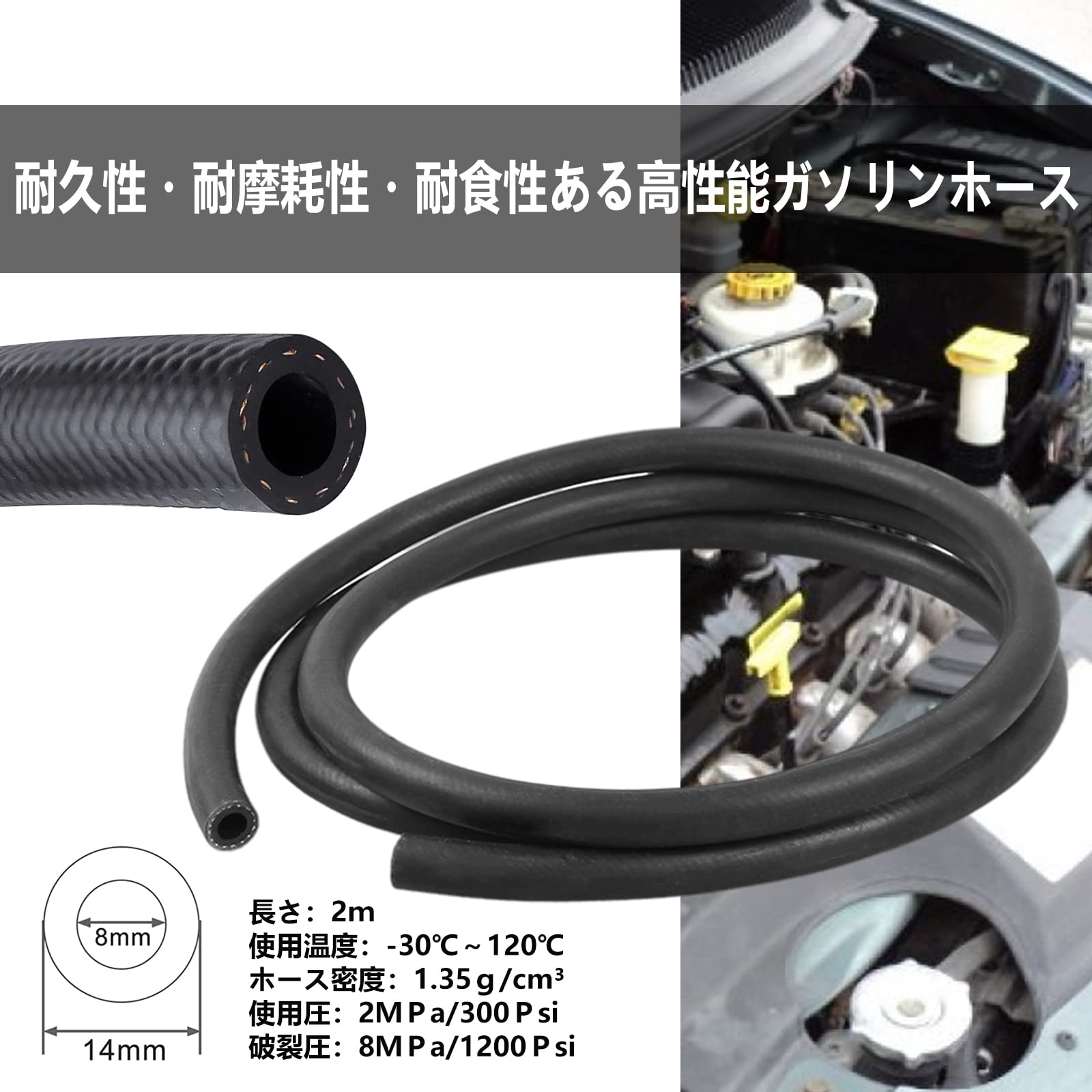 【ガソリンホース付き】3層耐油ゴムホースです、内側が耐油ゴム製、中間層がナイロン繊維製、外側が耐熱ネオプレーン製です。耐油性・耐高圧・耐候性に優れています。内径8mm外径14mm。長さ2Mもあり、必要に応じてカットできます。