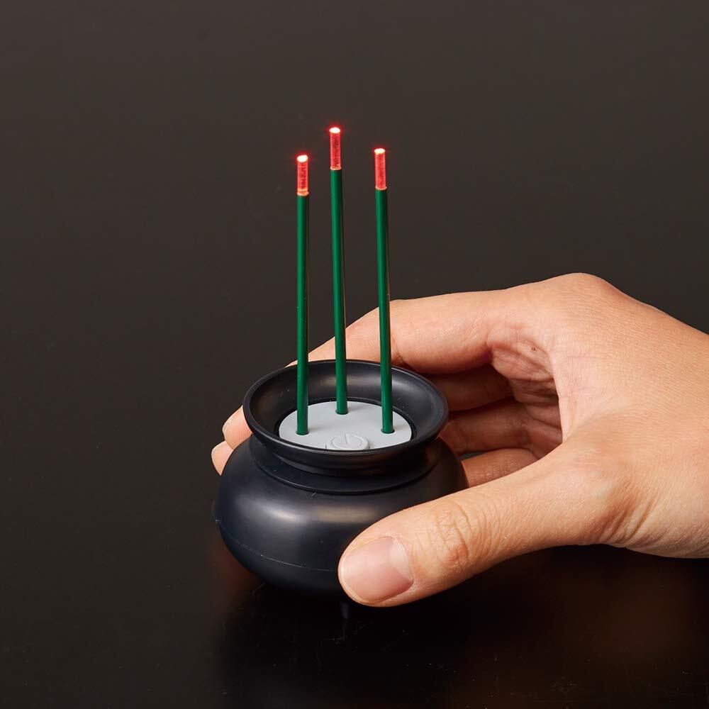 消し忘れの心配無し!火を使わないLED線香。自動消灯で安心してお使い頂けます。小さなお子様がいるご家庭や一人暮らし、ペットがいるご家庭に。ミニサイズで、コンパクトな仏壇、神棚にも。約10分間の自動消灯機能付。線香の本数は調整可能。※線香をなくさないように注意してください。