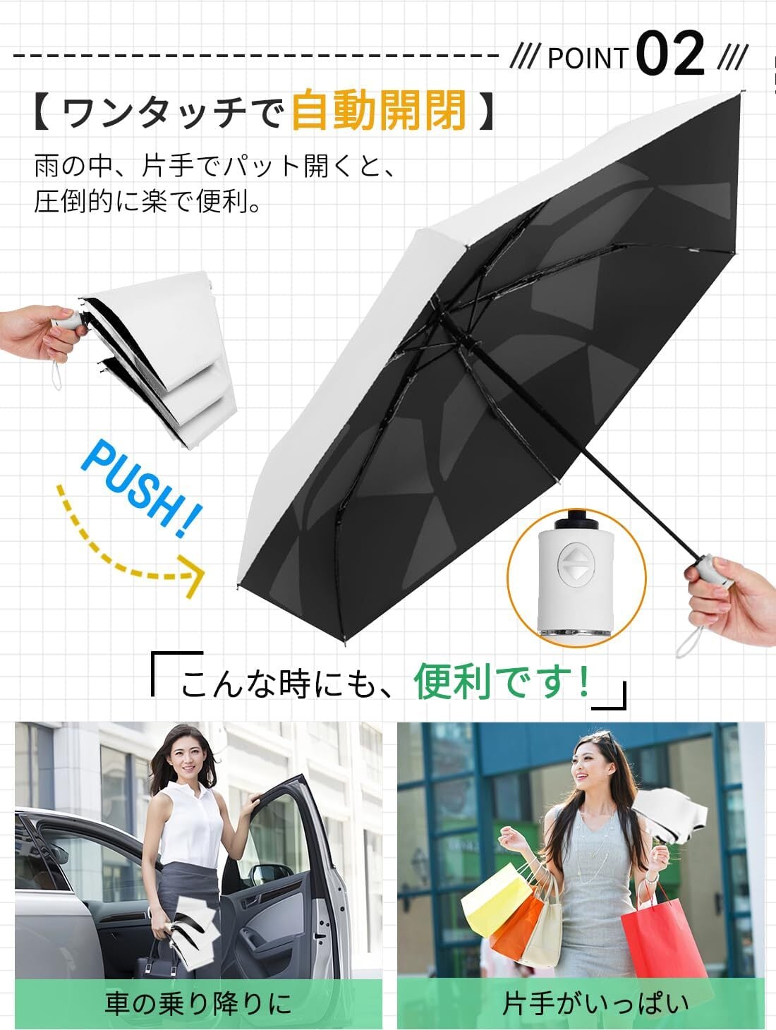 【自動開閉・片手で楽】たった3秒で折りたたみ可能で、ボタン一つで自動開閉もできます。傘を開くときは留め具のボタンを外したら傘を上へ向けてボタンを押すだけ、スムーズに素早く柄が伸びて傘がしっかり開きます。片手で傘先の金具に固定する必要がないので、荷物が多い時、降雨時に車から降りる時にもパッと開く、濡れる心配がなく、圧倒的に楽で便利です。