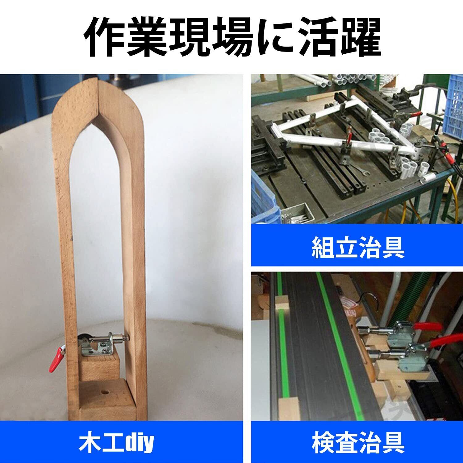 【小型・強力】トグルクランプ本体重量はわずか123gと超軽量タイプですが、最大90㎏保持力を有します。木材や金属にネジで固定すると、すぐに小型作業台になります。小さな操作力で大きな力を出すことができます。検査治具をはじめ、熔接治具、その他組立治具、加工治具に最適、木工diyにも適します。