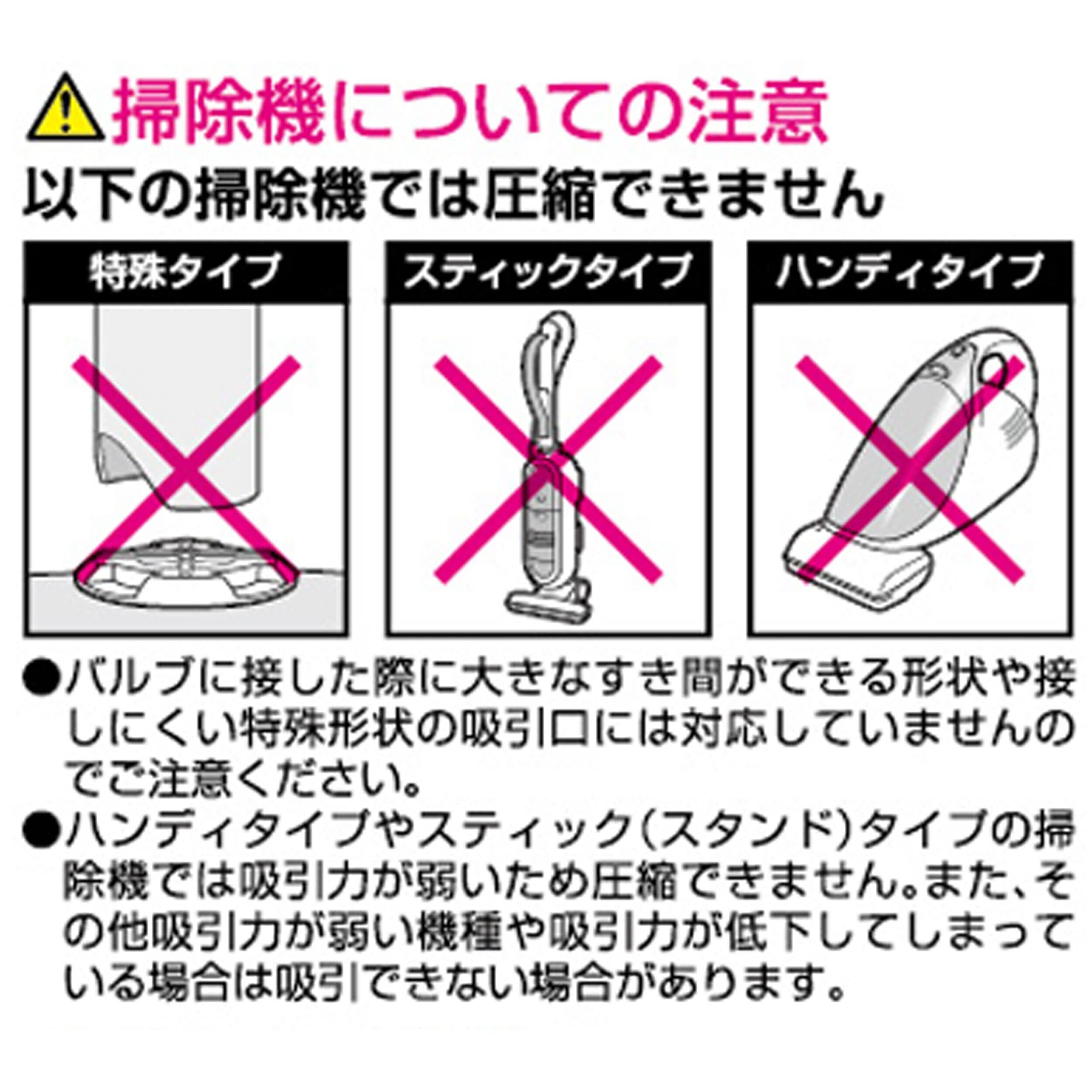 ●無機系防ダニ剤配合掃除機のいらない圧縮パック(掃除機でも圧縮OK)。●この圧縮パックは、フィルムの内側に無機系防ダニ剤を練り込んでいます。●押すだけでも掃除機でもどちらでも圧縮OK!。