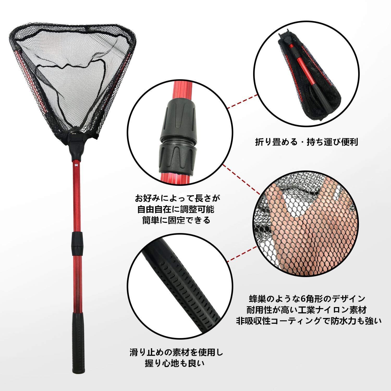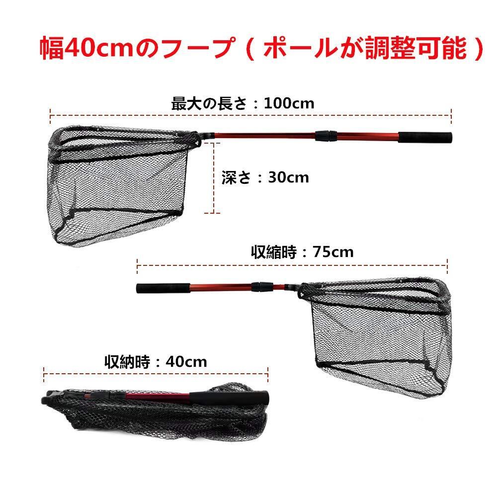 【商品仕樣】全長:100cm、収縮時:75cm、収納時:40cm、重量:299g、網の幅:40x40cm、網の深さ:30cm、柄の材質:高品質アルミ、垂直方向に持ち上げる場合:<5kg、前後方向に沿って持ち上げる場合:<20kg。ワンタッチで展開! 折りたたみ式で、携帯楽々! ランディングネットとも呼ばれ、釣りに行くなら必携のアイテム!