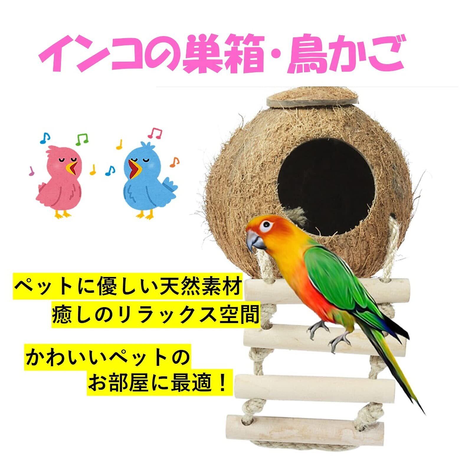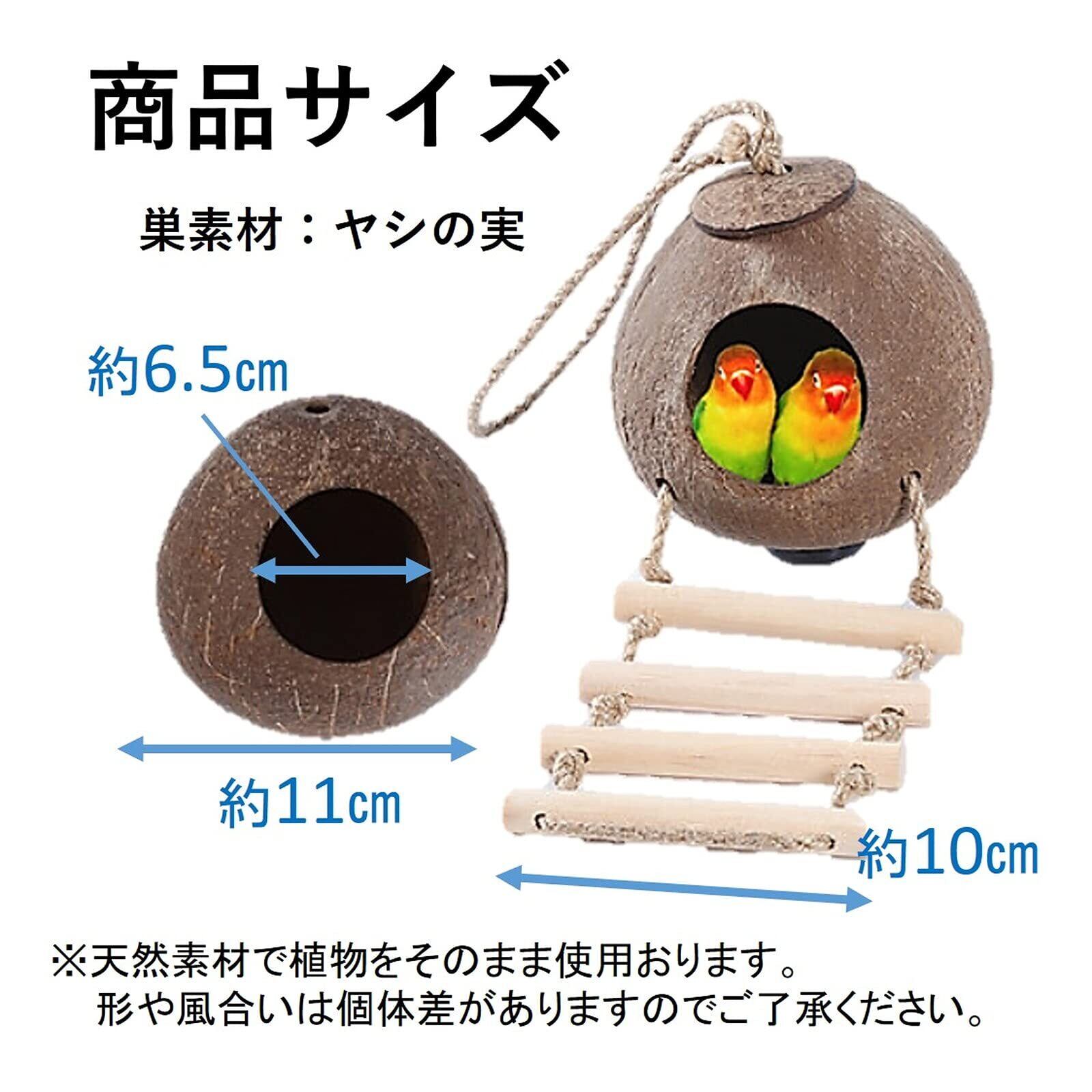 【商品データ】巣箱サイズ約11㎝×11㎝ 巣穴約6.5㎝ はしご幅10㎝ 素材 ヤシの実 ※※天然素材で植物をそのまま使用おります。 形や風合いは個体差がありますのでご了承ください。