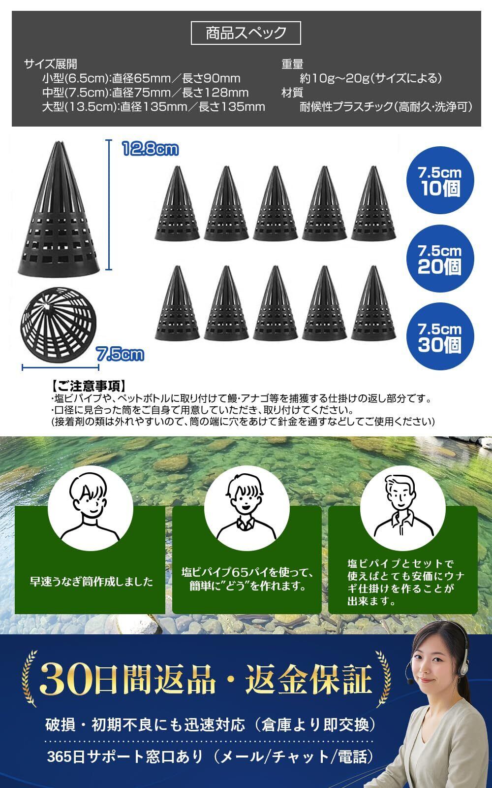 【設置も簡単ラクラク】ホームセンターで売っている塩ビパイプや、ペットボトルに取り付けて、エサを入れて沈めておくだけで、簡単に鰻・穴子などの獲物を捕獲できます。筒から侵入すると出られなくなるタイプで実用的です。