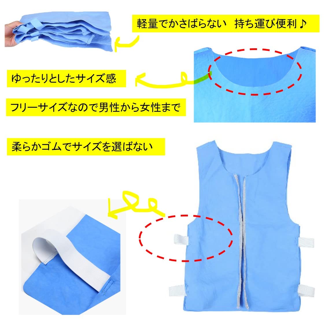 男性から女性まで安心してご使用になれるフリーサイズで、着脱しやすい前開きのデザイン!サイドに柔らかゴムを使用しているので安心してゆったりと着用になれます!また、軽量かつかさばらないため持ち運びにも便利気化熱を原理とした冷却方法で必要なのは水だけ!繰り返し使えて環境にも優しく、電気代の節約にもなる便利なアイテム