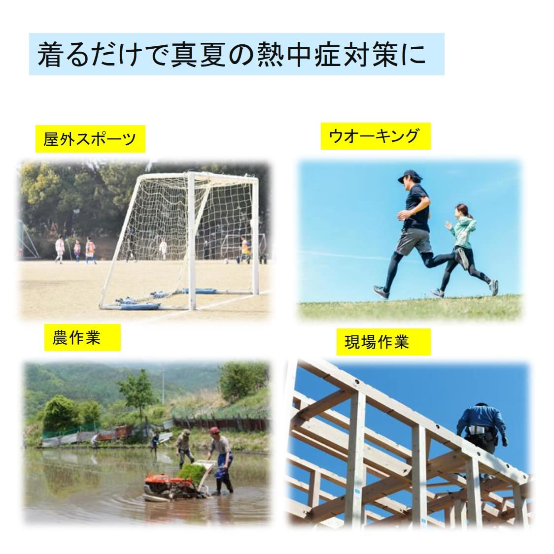 空調のない施設や厨房、炎天下での現場仕事、農作業などの高温環境での使用に適しており、日常的に快適な作業環境を提供する重要なアイテムです。また、サッカーや野球などの屋外スポーツ、お祭りや運動会などのイベント、登山やサイクリング、釣りなどアウトドアを楽しむ際の熱中症予防にも効果的!!