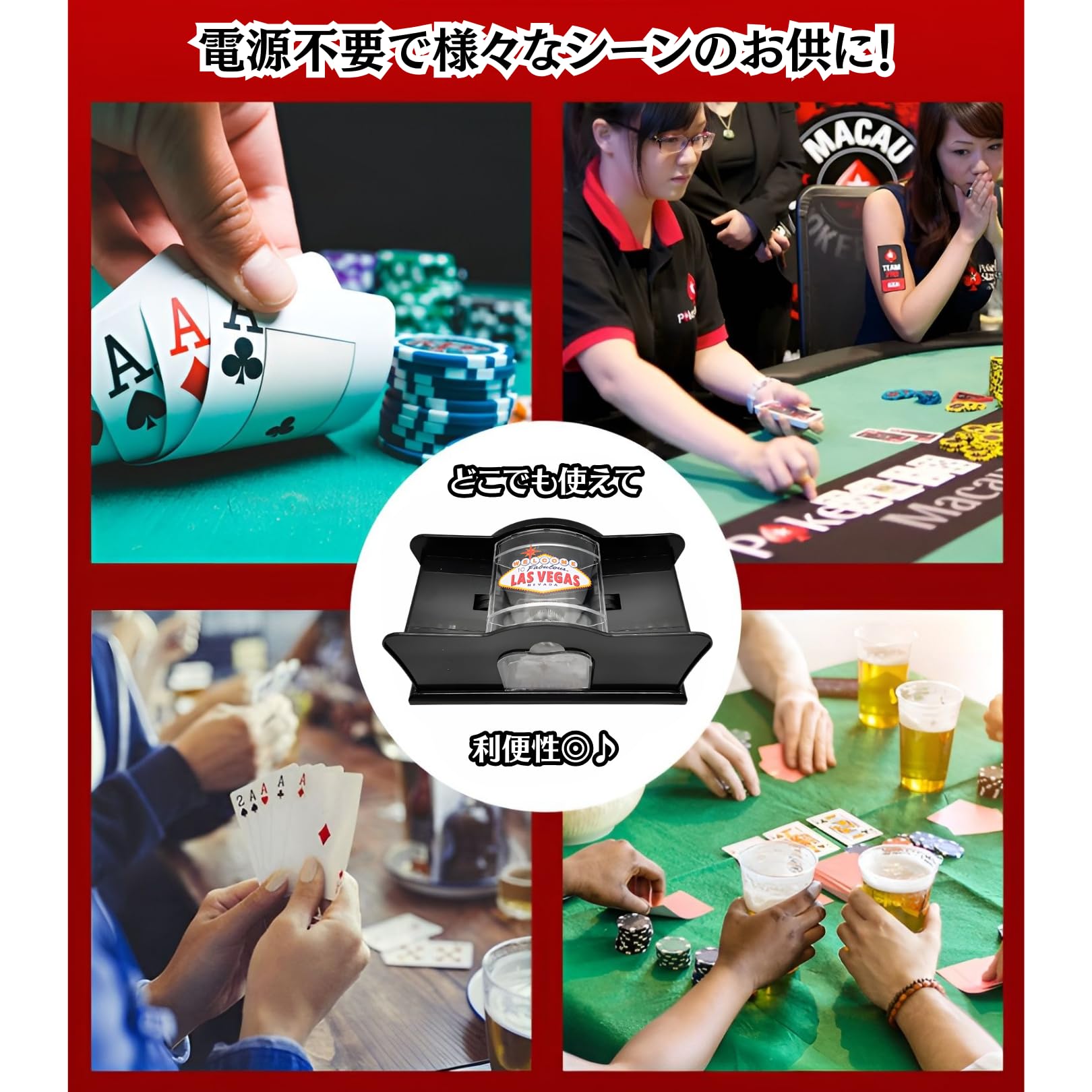 【素早く正確なシャッフル】ハンドシャッフルよりもお手軽に、しっかりとカードを切り混ぜることができます!カードに偏りや傷みが出づらいため、安心してゲームを行うことが可能です。公平性・不正防止の演出としても効果的です。