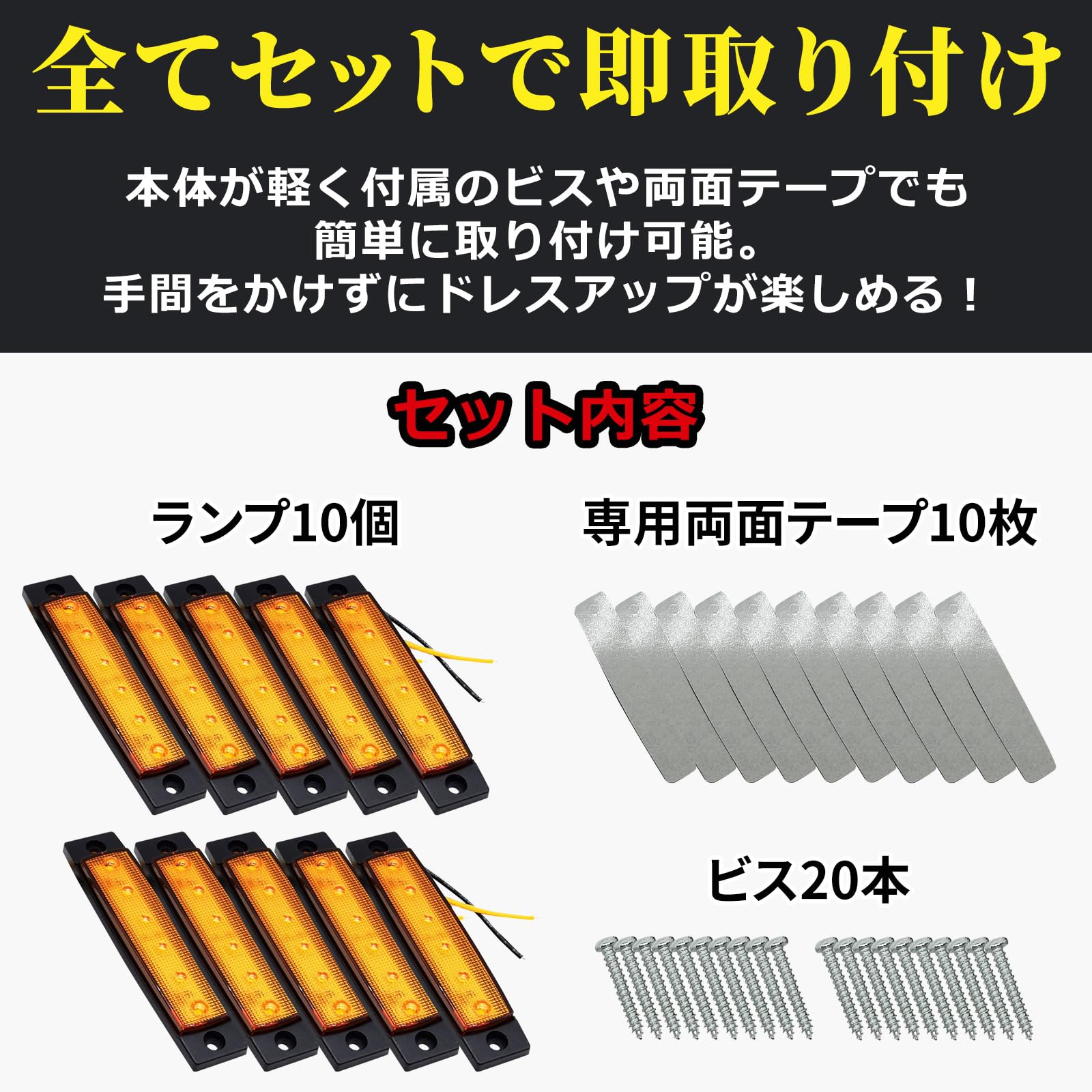 セット内容:10個セット(マーカーランプ x 10個、両面テープ x 10枚、ビス20本)