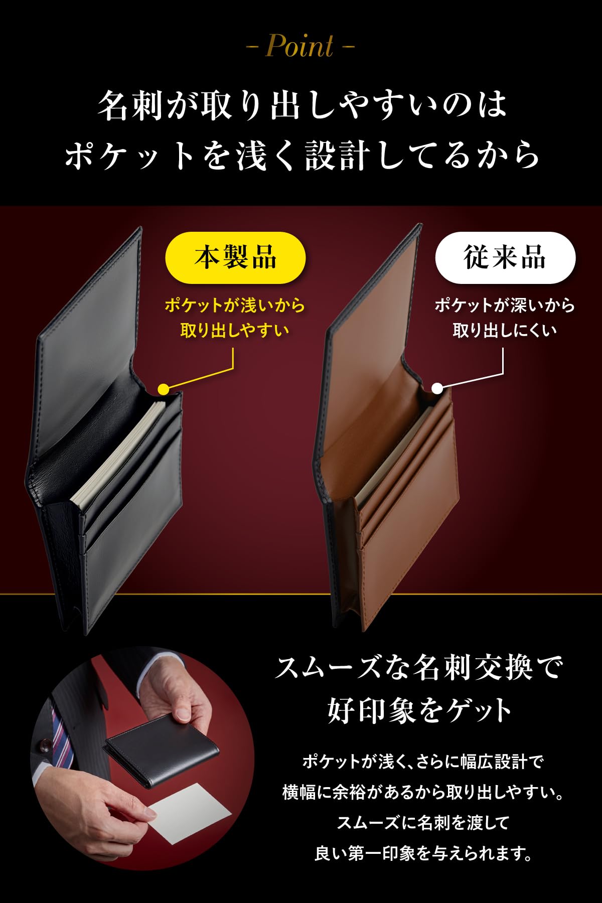 【名刺を取り出しやすくポケットを浅く設計】一般的な本革名刺入れはポケットが深く作られていて名刺が取り出しにくいです。そこで、この名刺入れはポケットを通常より少し浅めに設計しました。さらに幅広設計で横幅には余裕があるから取り出しやすいです。さっと取り出せてスマートに名刺交換できるので、良い第一印象を与えられます。名刺が折れないように設計しています。