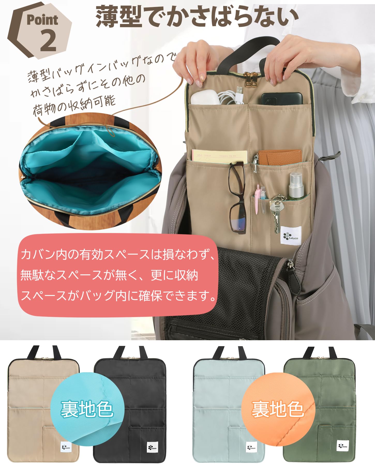 【薄型でかさばらないバッグインバッグ】バッグの容量を損なわずに収納できる薄型で縦型のバッグインバッグです。リュックやトートバッグなど様々なバッグに対応し、持ち手付きなので取り替えも簡単です。