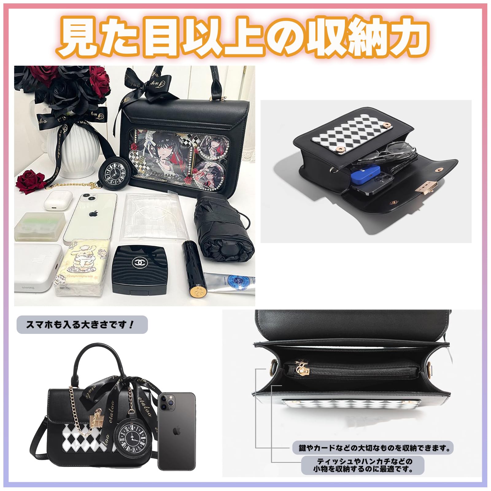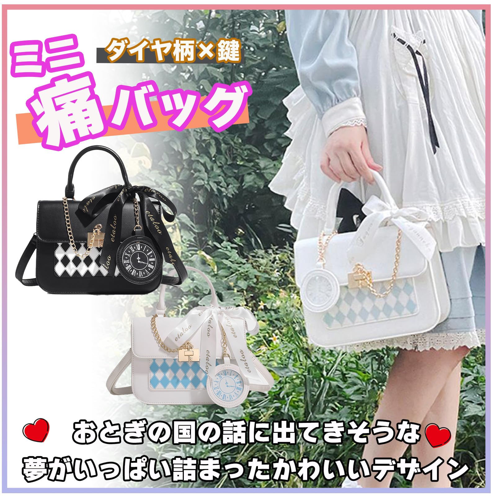 ダイヤ柄のデザインと鍵をモチーフにしたデザインがとても可愛らしくアンティークなデザインとなります。時計風のキーホルダーも付属していて、おとぎの国の世界観をこのミニバッグ全てに詰め込んだ夢のようなデザインのバッグです。背面はクリアポケット仕様になっており、好きな芸能人やアニメのグッズや写真、缶バッジ、ぬいぐるみなどを入れて、自分だけのオリジナルバッグを作ることができます♪アレンジしたい放題なので世界に一つだけのバッグを作ることができます。クリア部分を裏にしたら痛バッグ感がゼロなおしゃれなバッグに大変身なので2wayとして、通勤や通学、プライベートでも使用できるのでお仕事終わりに推し活バッグを使いたい時に、とても便利なアイテムです♪