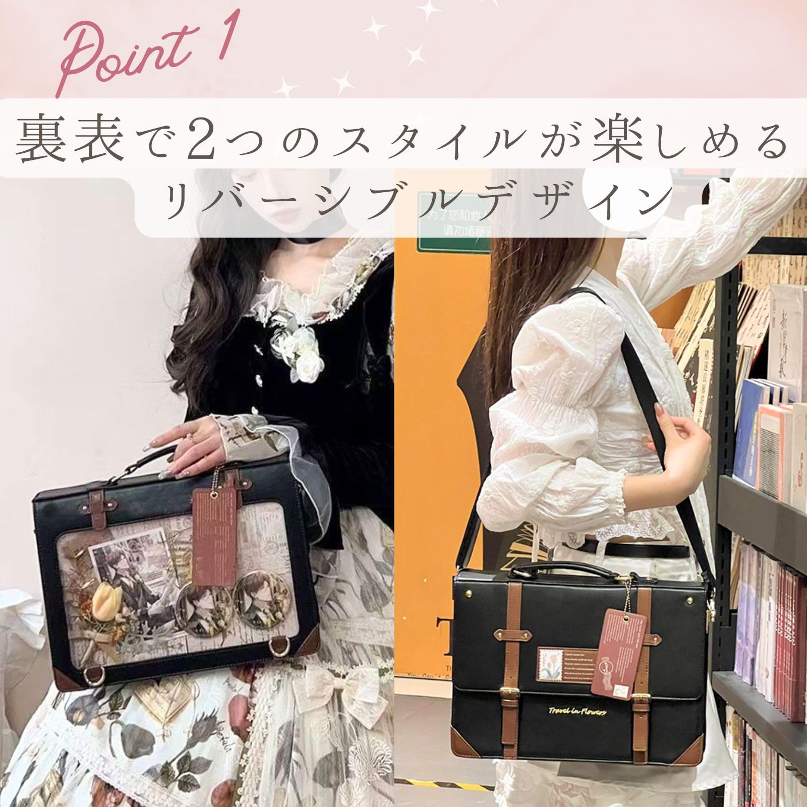 ?? ゴシック調のデザインが可愛い痛バッグ です♪ レザー調の素材を使っており、可愛さに上品さをプラス☆裏表で2つのスタイルが楽しめるリバーシブルデザイン。シーンに合わせてバッグをひっくり返して普段使いや推し活に♪