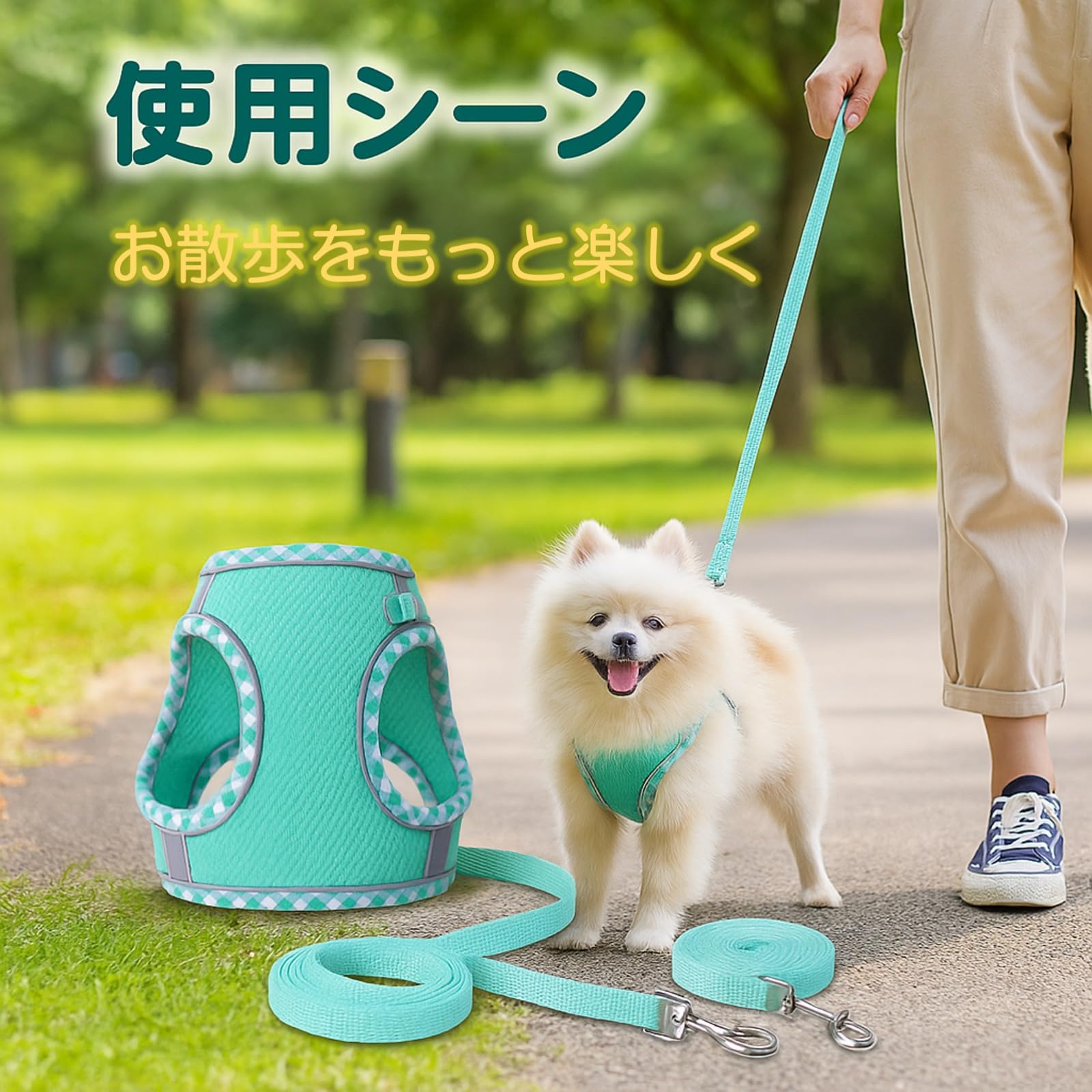 ルボナリエ ペット ハーネス リードセット 小型犬 猫 中型犬 反射ストリップ メッシュ (グリーン L)