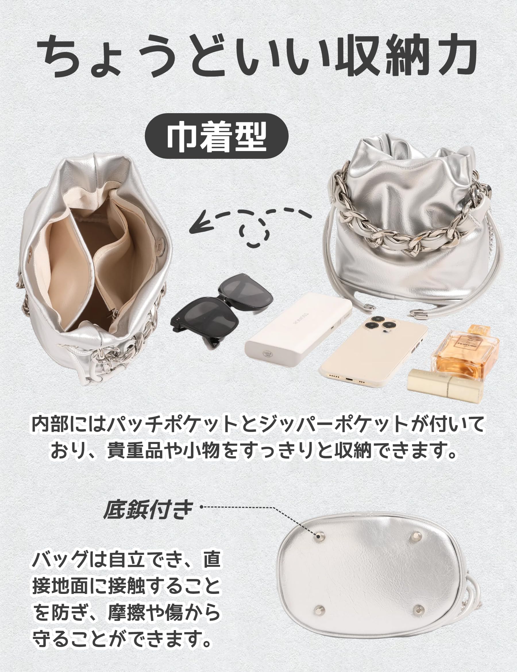 デザイン:レジャーな雰囲気があり、普段掛けならどんな格好にでもあわせやすいです。開口部は大きく、巾着型で物が落ちにくく、必要に応じて物を出し入れするのも簡単です。底に四つの底鋲があることで、バッグが自立しやすく、置いたときに倒れにくくなります。底鋲が直接地面に接触することを防ぎ、底部の摩擦や傷からバッグを守ることができます。また、バッグが潰れたり、形が崩れたりするのを防ぎ、見た目の美しさを保つことができます。持ち手のシルバーチェーンは、バッグに独特のスタイルとアクセントを加えます。一見シンプルなハンドバッグでも、ハンドルのデザインによって、より高級でエレガントなものになります。滑らかなシルエットと洗練されたデザインのバケツバッグはファッション性が高く、どんなコーディネートにも相性が良く、持つ人の個性を引き立てます。