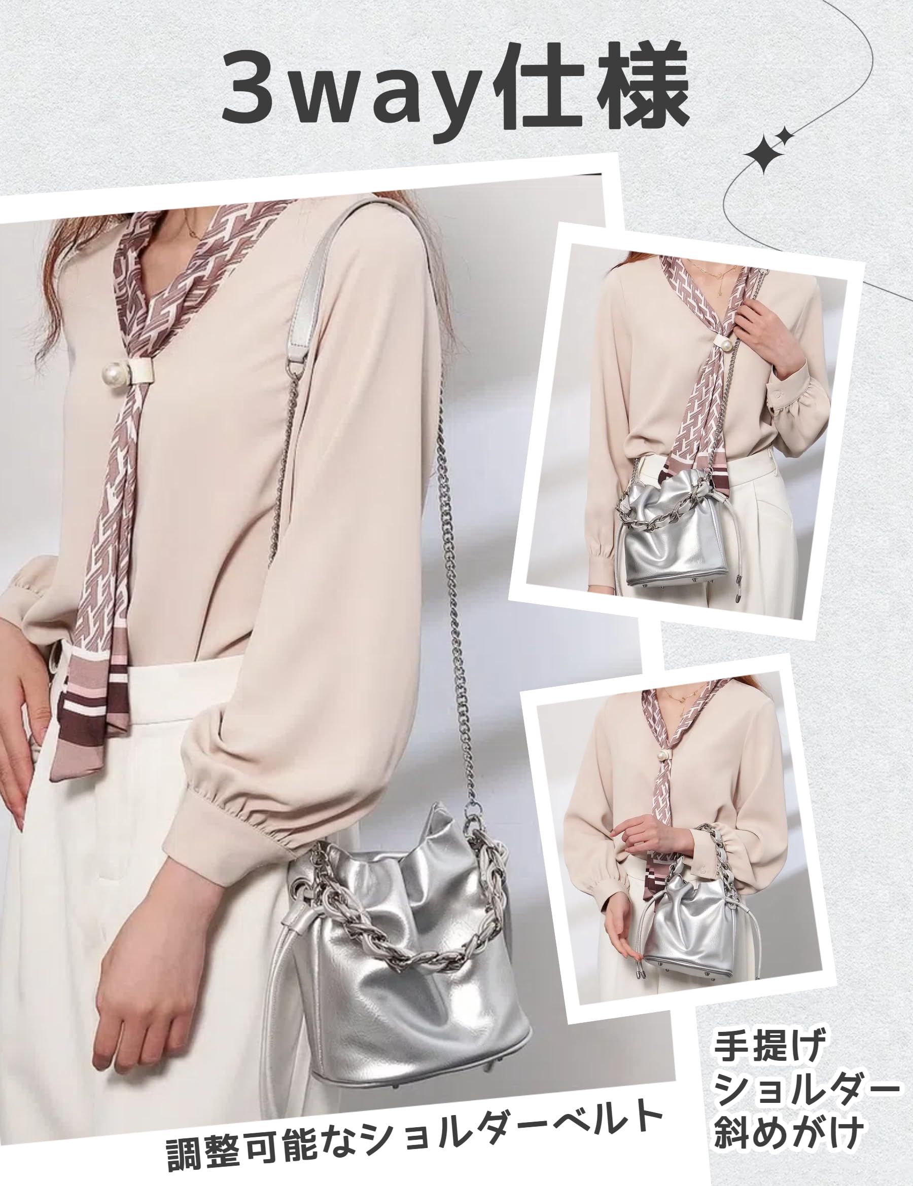3way仕様:長さ調整可能なショルダーベルト付きで、ハンドバッグ、ショルダーバッグ、斜めがけバッグの3つのスタイルに簡単に切り替えられます。持ち方を変えることで、ルックも変わります。手提げとして持つとエレガントな印象、ショルダーや斜め掛けにするとカジュアルな印象を与えることができます。ファッションに合わせてスタイルを楽しむことができます。また、色展開が豊富で、ブラック、ベージュ、シルバーの3色あり、どの色もシンプルでありながらおしゃれ感が漂います。機能的でデザイン性の高いバッグなので、アウトドアはもちろん、通勤通学でもぴったりで、シーズン・年齢を問わず長く使えるバッグです。サラリーマンやマザーズにもお勧めします。注意:サイトに掲載されている商品は、モニター環境により実際のものと素材感、色が若干異なって見える場合がございます。