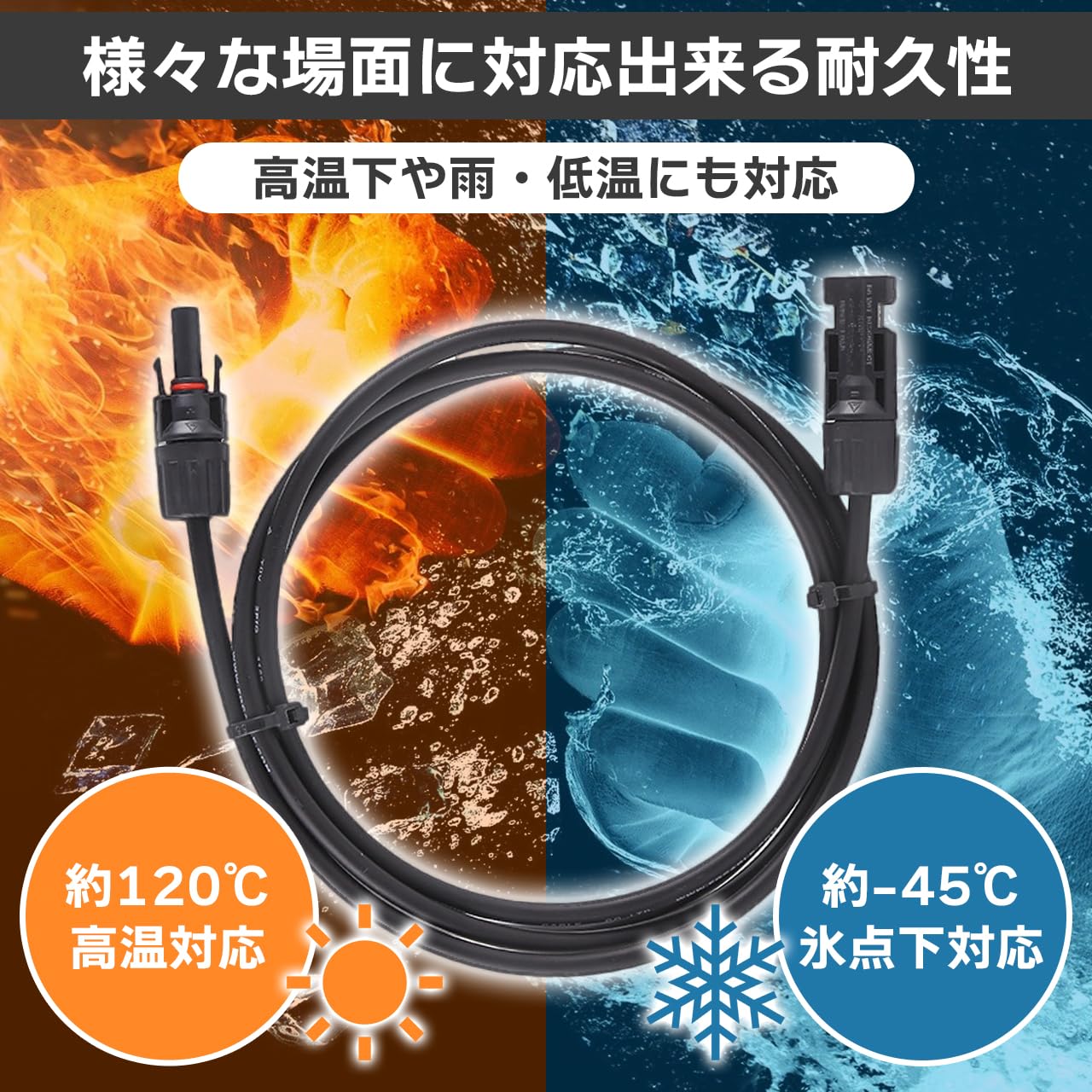 ・一般的なソーラーパネルのコネクタ規格である「MC4規格」に対応した延長ケーブルです。 ・長さ:赤黒各5m 太さ:4sq (12AWG) ・ケーブルは、太陽熱システムを含む応用に適したIP67防水&-40℃+ 125℃の作業温度、屋外で使えるために設計されており、湿気、UV、耐食性の抵抗に対して優れています。 ・太陽光パネル用ケーブル、太陽光パネル間の延長用ケーブル、太陽光パネル と接続箱間の引込用ケーブルとしてご利用いただけます。