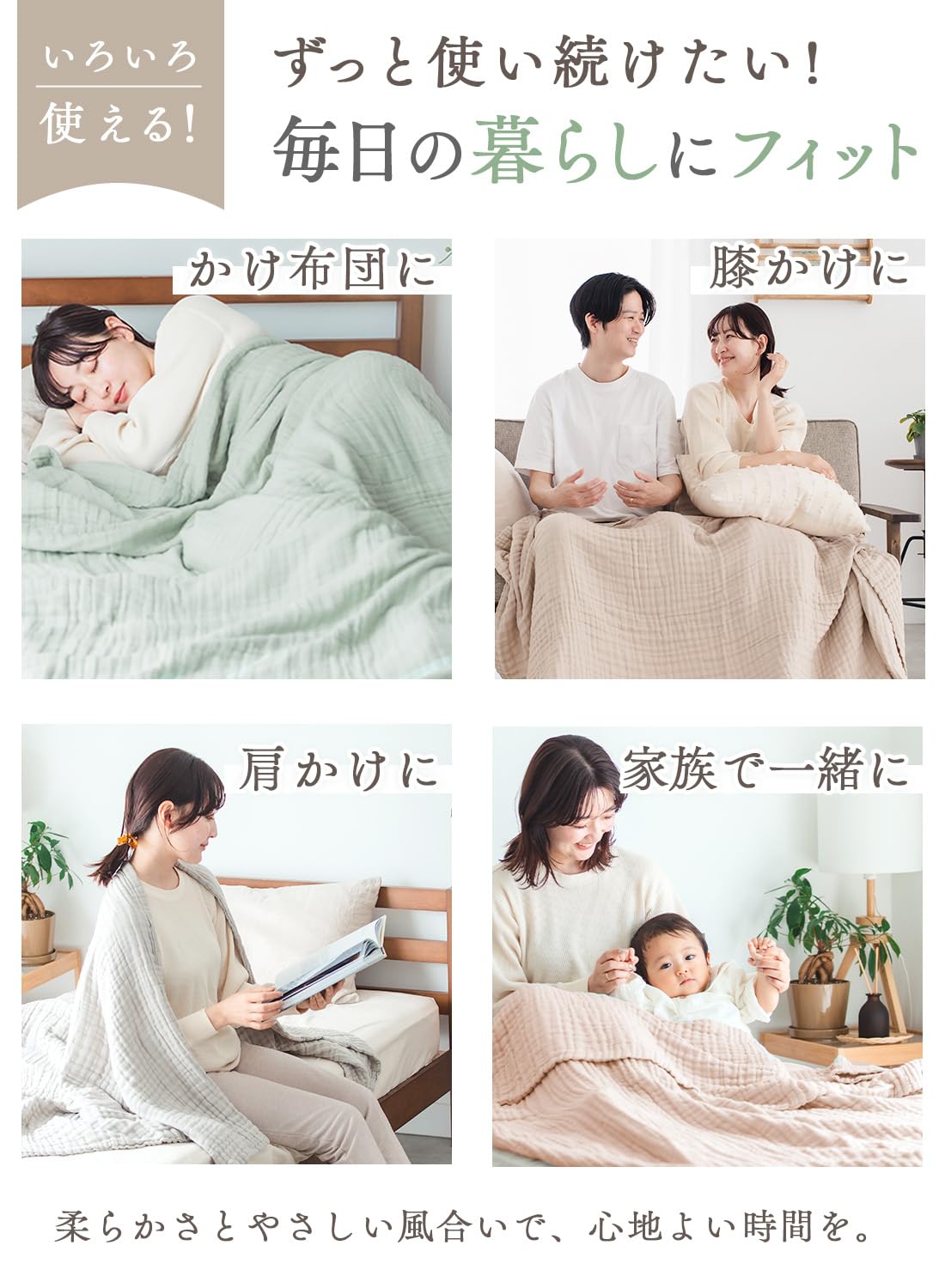 【オールシーズン使える】綿100%のガーゼの層は風通しが良いので通気性に優れていて、軽やか。ムレやすい暑い季節の掛け布団にぴったりです。保温性もあるので冬の季節には掛け布団の下にいれて快適にお使いいただけます♪