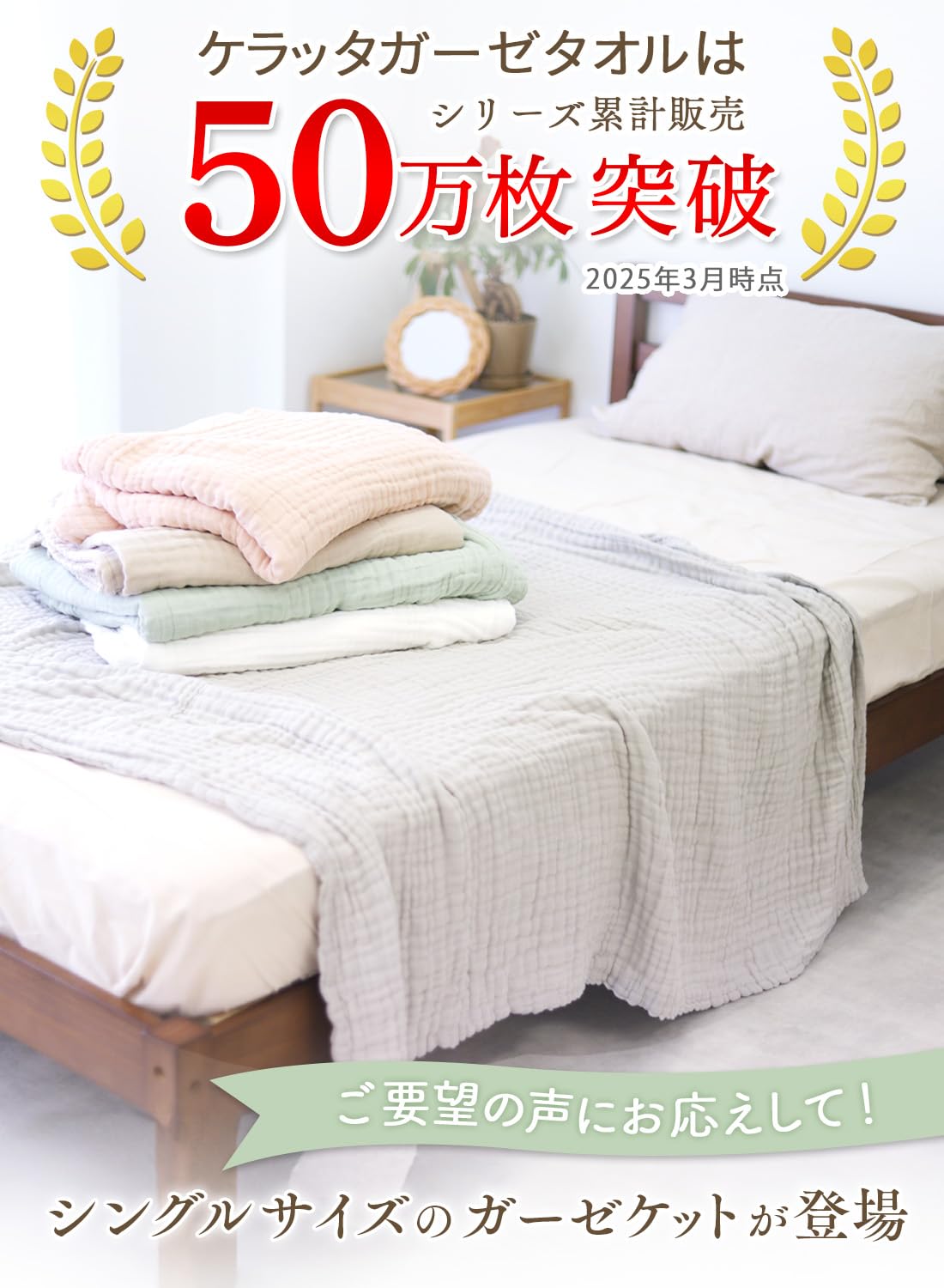 累計販売数400,000枚突破した大人気のケラッタガーゼタオルから、ご要望の声にお応えしてシングルサイズのケットが登場!ふんわりやわらかで気持ちいい〜6重ガーゼが心地よくからだを包み込みます。
