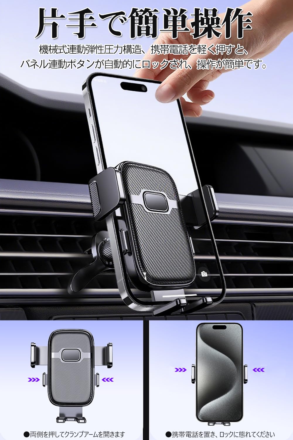 【片手で簡単操作& 通気に邪魔なく】ロックとリリーズをワンタッチで実現、スマホを簡単かつ安全に着脱でき、車載スタンドの使用をすばやく便利です。クリップ 車載ホルダーは通気性を妨げることなく、スマホを過熱させません。快適な環境を作り、運転に欠かせないパートナーです!