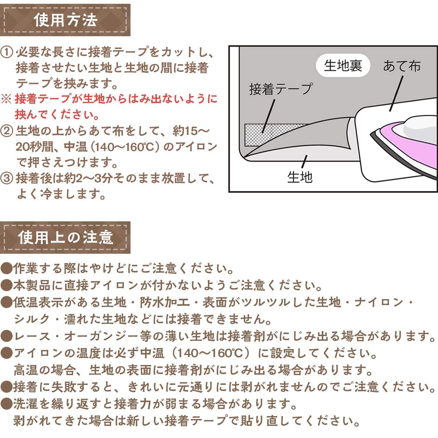 ・低温表示がある生地、防水加工・表面がツルツルした生地、ナイロン・シルク・濡れた生地などには接着できません。
