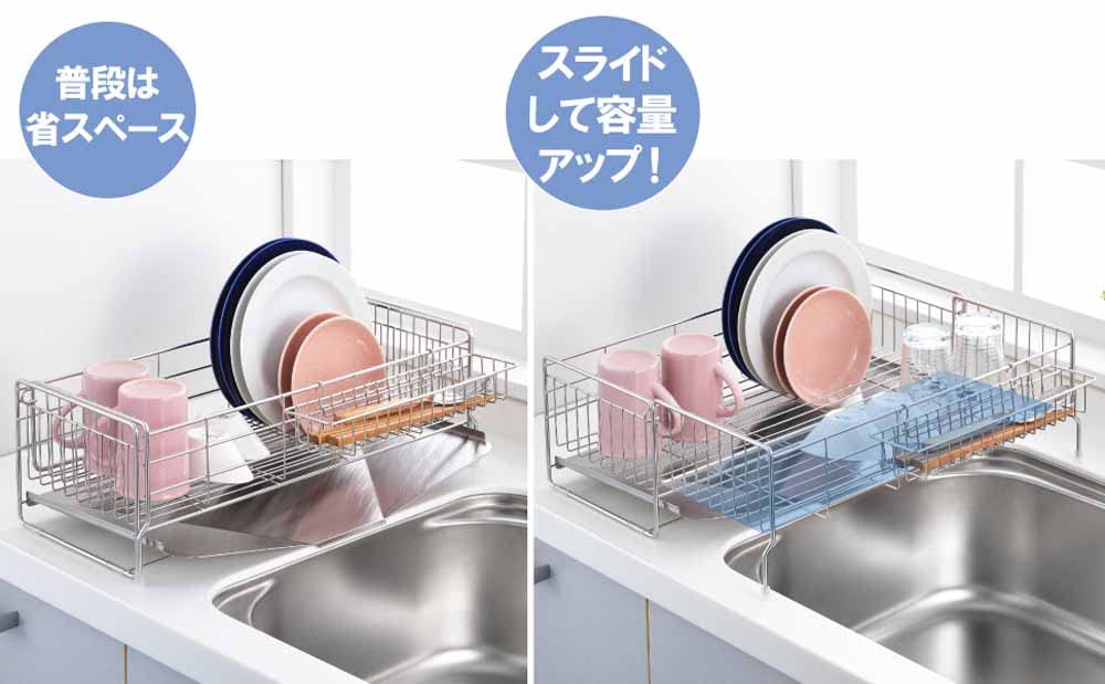 水切りラックがスライド収納できるので容量に合わせて使用できる