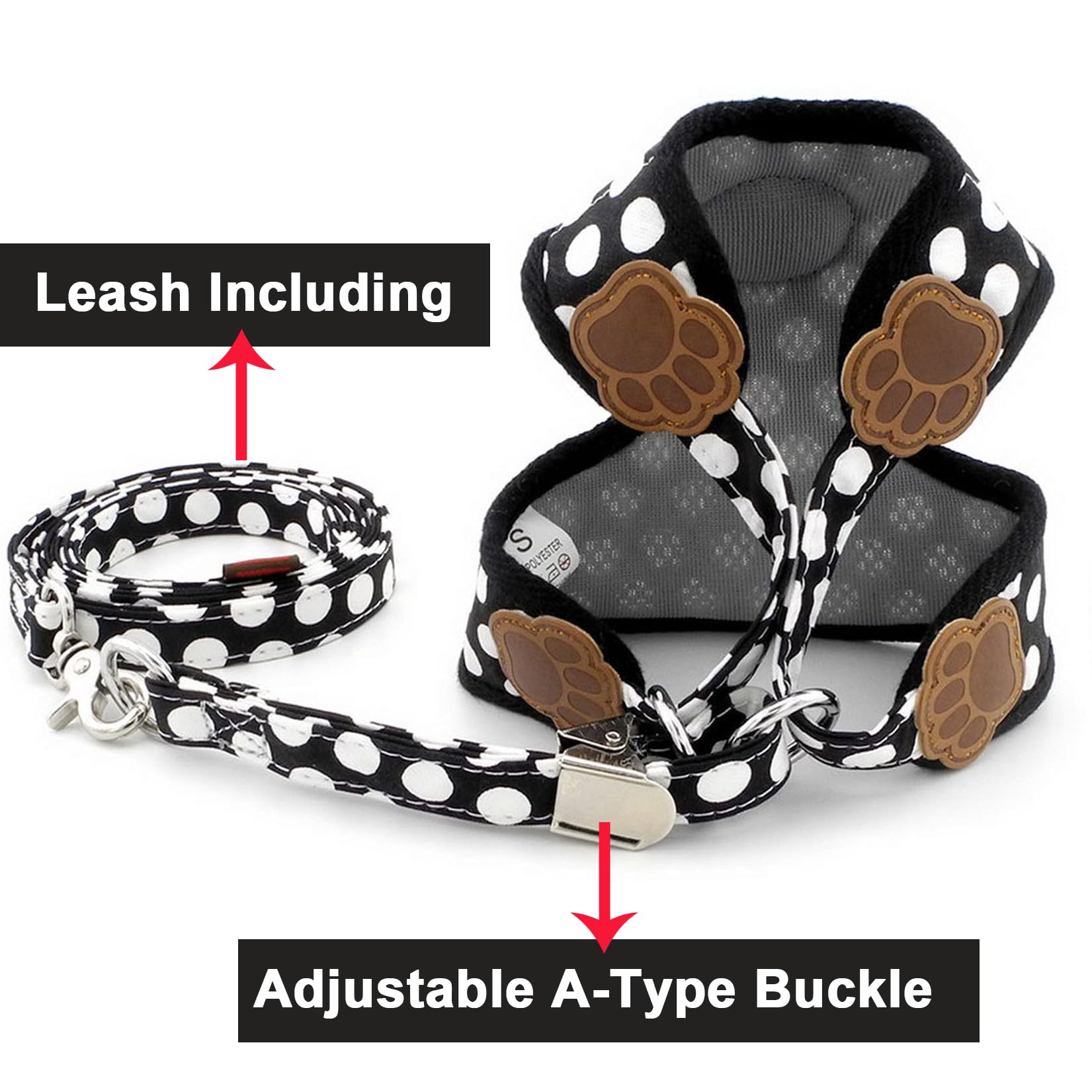 ZUNEA 犬用 ハーネス リード セット 可愛い ドット柄 ソフトメッシュ 胴輪 チワワ用 散歩 ペット用品 ドッグウェア 小型犬用 ブラック, L