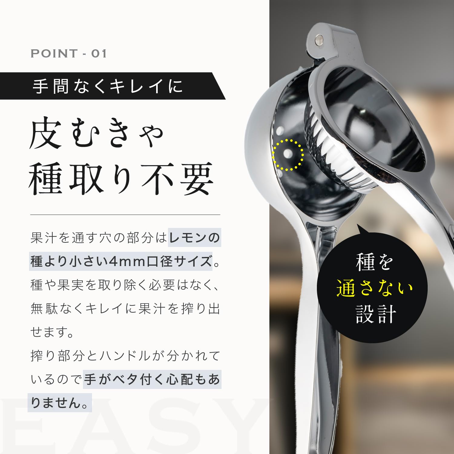 【レモンが簡単に絞れる】今まで面倒だった皮剥きや種を取る作業は必要がありません。果汁を通す穴の大きさはレモンの種より小さい極小4mm口径。キャッチ部には果実を逃さないローレット加工を施しています。