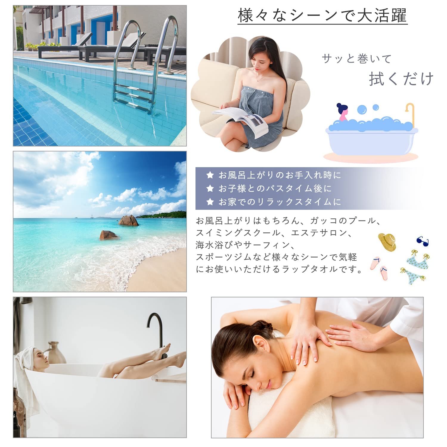 【年中使える】季節に問わず、年中使えるラップタオルです。シャワー、ジムやプールなどの後のにさっと着られてとっても便利です。お子さまとのお風呂やプールでのお着替えにも! プール、銭湯・温泉、エステ、ジムなどシーンで大活躍!