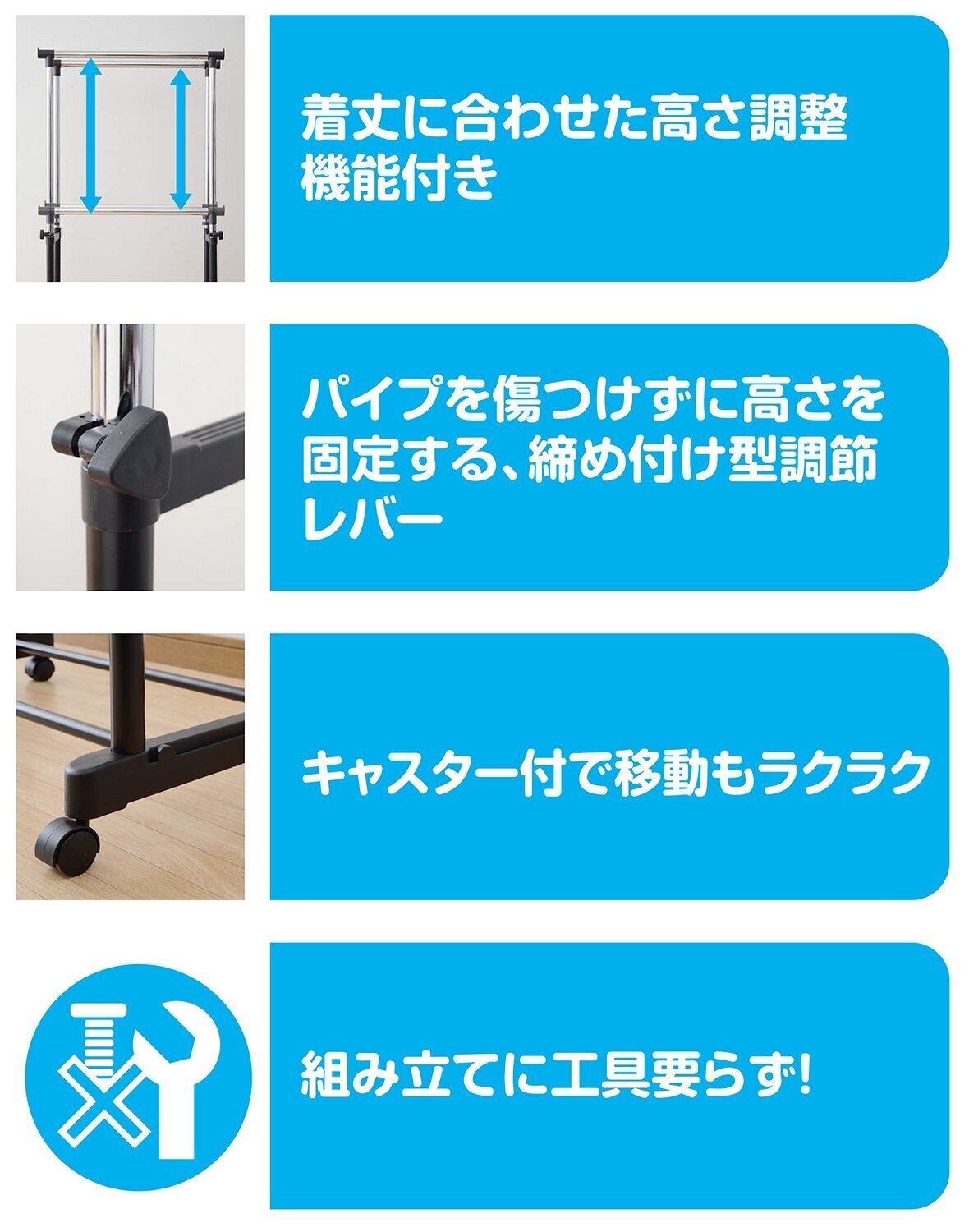 山善(YAMAZEN) ハンガーラック ダブル 2段 高さ伸縮 耐荷重15kg キャスター付き 幅75×奥行43×高さ89-152cm 組立品 ブラック MKS-W(BK)(S)