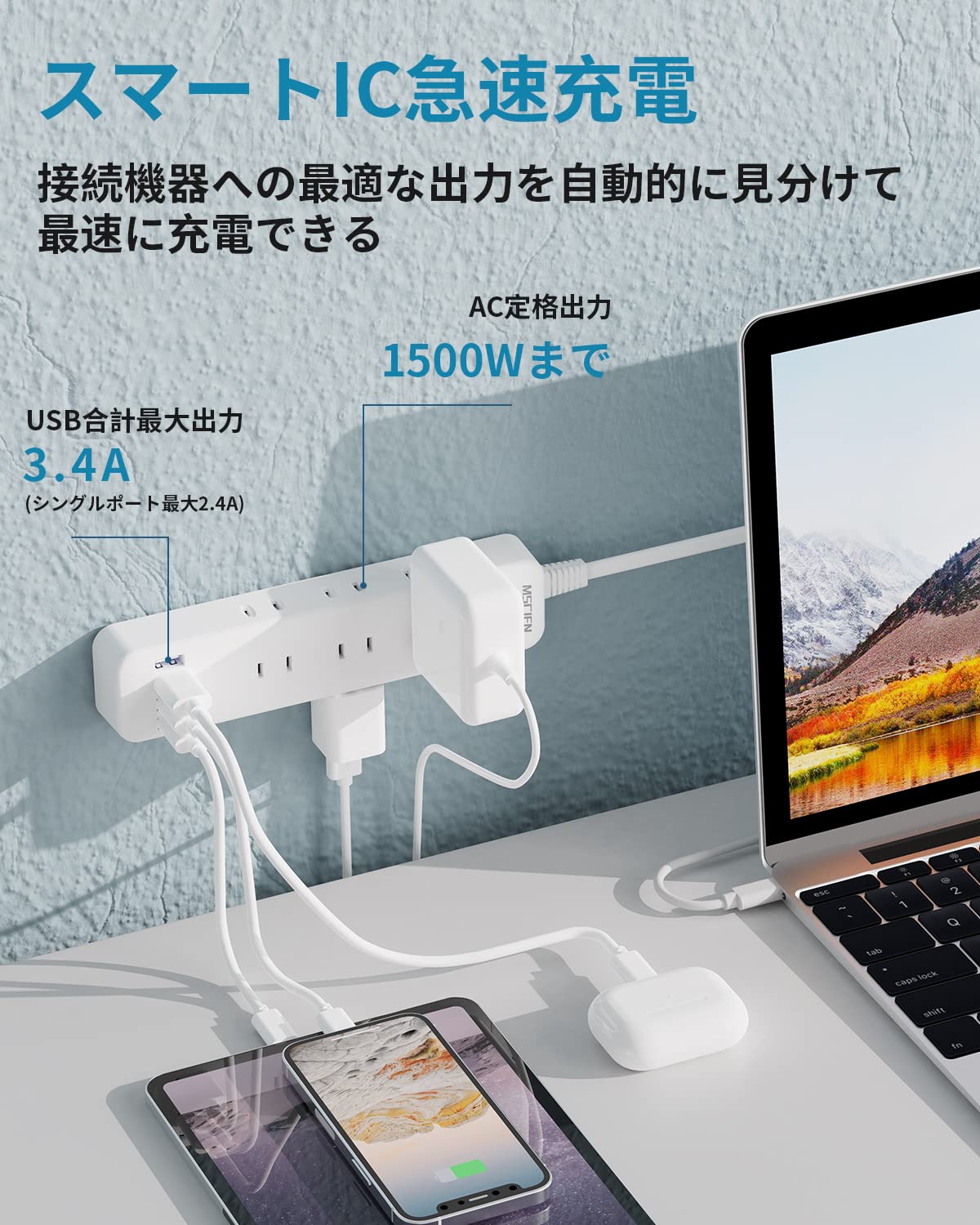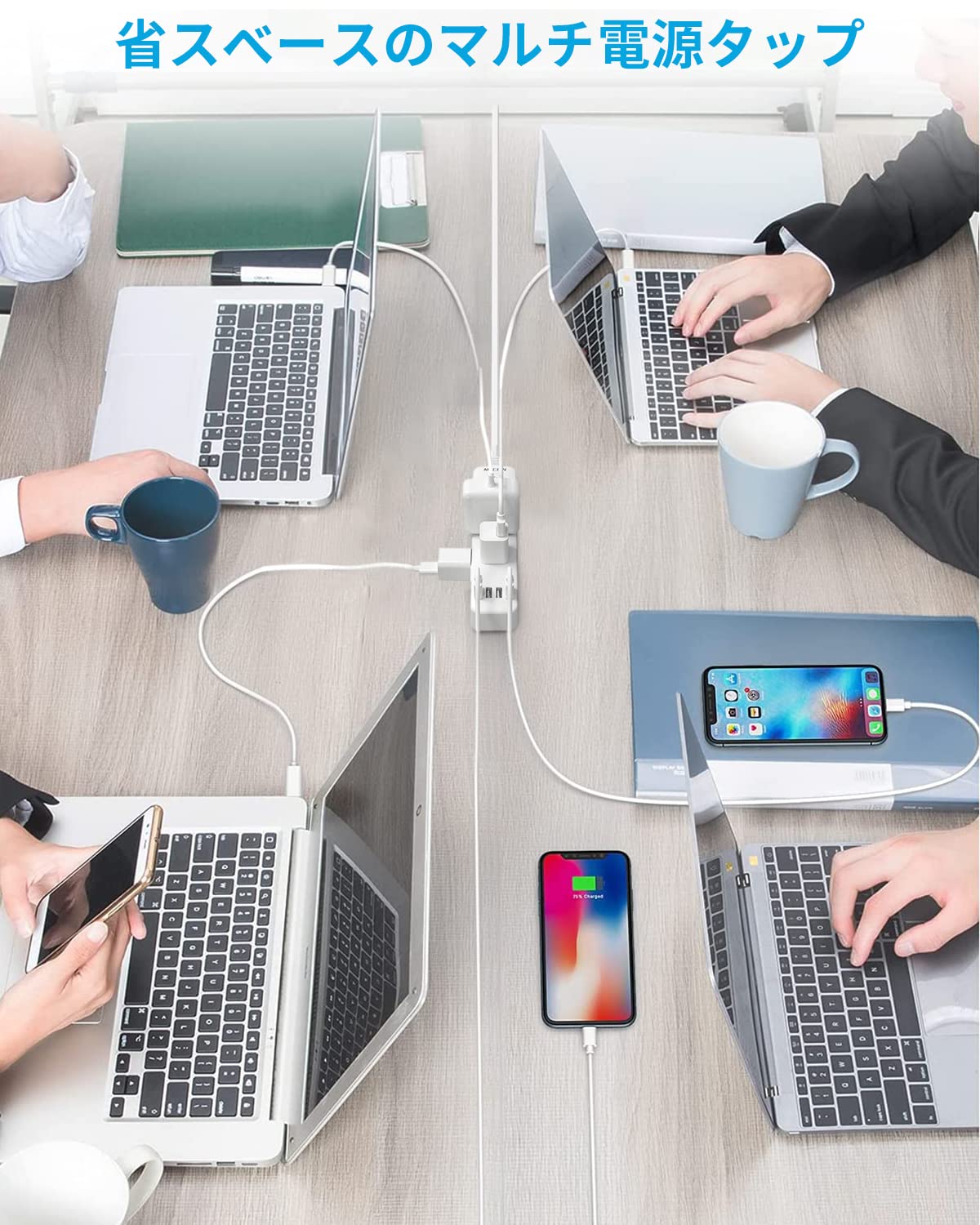 「1台13役・延長コード」9つAC差込口と4つUSB-Aポートがある電源タップです。延長コードがあって、便利です。延長コードの一部は製品本体内部に取り付けられるため、表示の製品線長には本体の長さが含まれております。