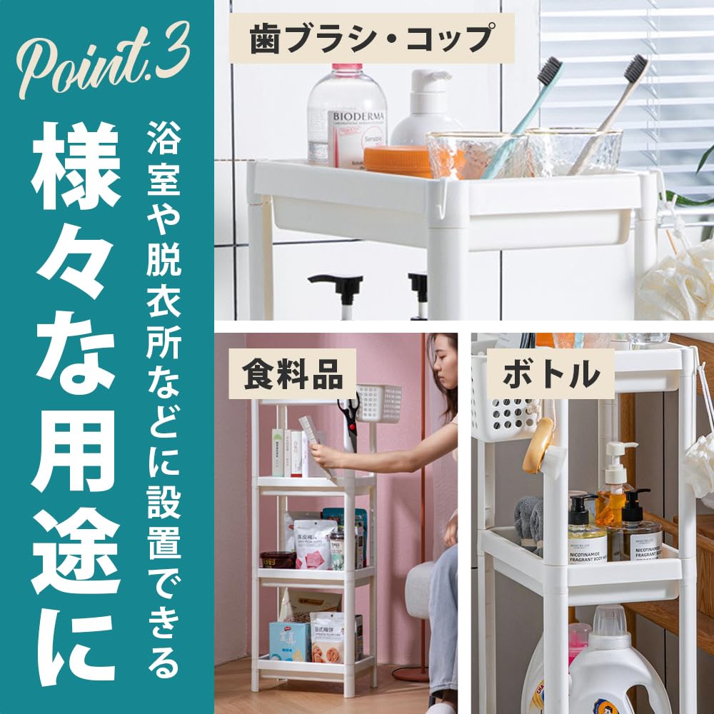浴室や脱衣所などに設置して洗剤・詰め替えパウチ・タオル・洗顔料・歯ブラシなど様々なアイテムを1ヶ所にまとめて保管できる収納ラックです。