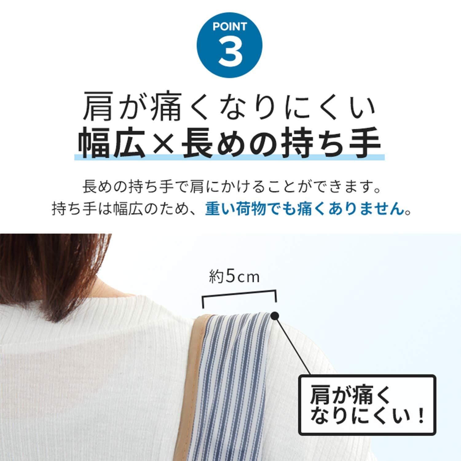 サイズは、40×59cmと大きめのサイズのため、沢山買い物しても余裕を持って入ります。また、持ち手を幅広にしたため、肩に掛けても痛くなる事がありません。そのため旅行の補助バックとしても使えます。