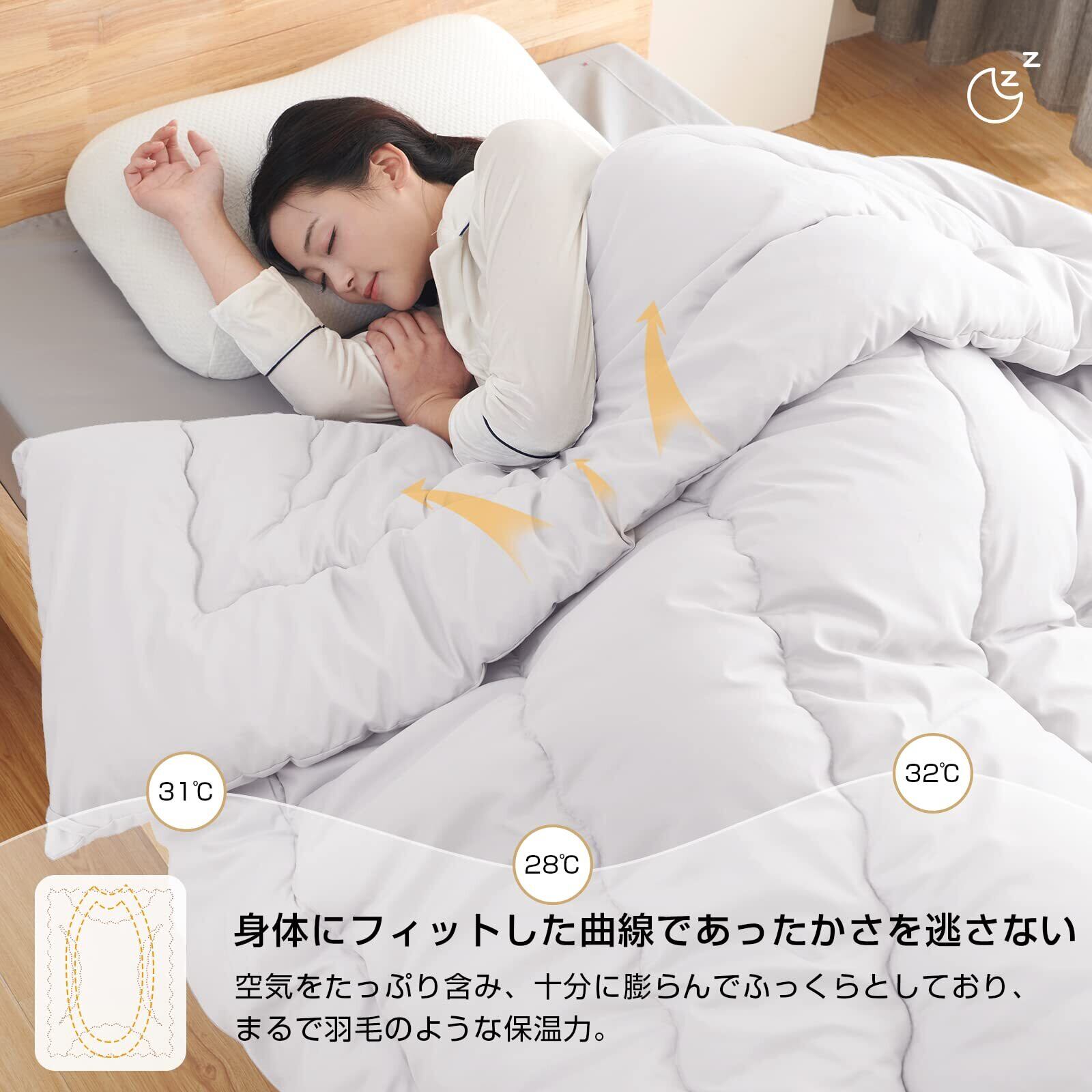 【ピーチスキン加工、やわらかくしっとり触感】肌に優しいピーチスキンの触り心地でしっとり気持ちよく、ムレにくく快適です。ほこりが出にくい、綿切れしにくい、中空ポリエステル綿を使用。ズレ防止ループ付き端の8ヶ所にズレ防止用ループが付いているので、お布団がズレる心配もありません。