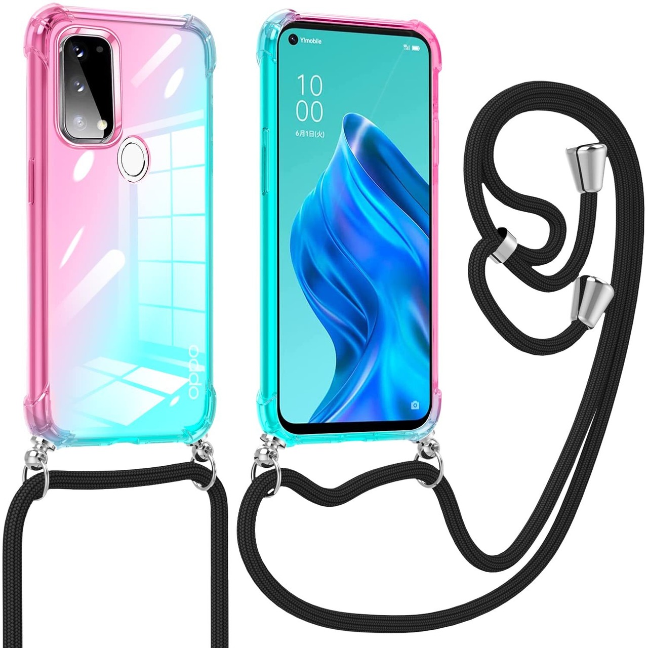 OPPO Reno5 A ケース ショルダー グラデーション ネック ストラップ付き クリアケース 耐衝撃 薄型 TPU 調節可能 肩掛け 縄掛けケース 黄変防止 軽量 ソフト 一体型 かわいい ファッション 携帯カバー ピンク/グリーン AYS-9-38