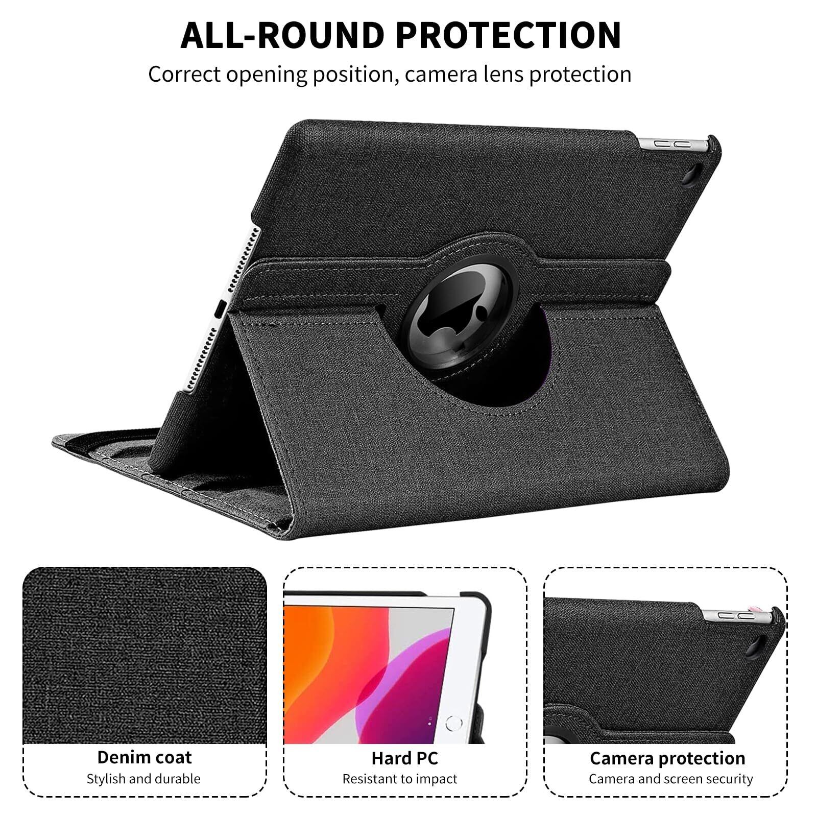 iPad ケース 9.7インチ 2018/2017 (第5世代 第6世代)iPad Air Air 2 カバー 360度回転式 手帳型タブレットケース オートスリープ機能 3段階調節可能 固定バンド 脱落防止 耐衝撃 耐久性 おしゃれデニム生地 (ブラック)
