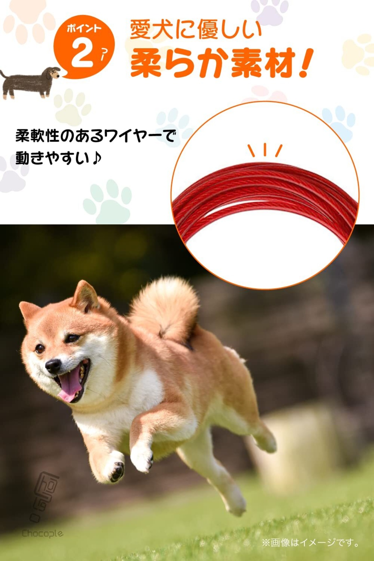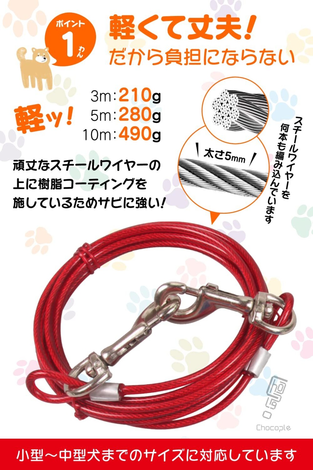 【愛犬の首に優しい】公園など散歩に行ったときに、木やポールに繋いでおくことが出来ます。ステンレスを樹脂でコーティングした丈夫なケーブルで、引っ張り衝撃から愛犬の首を守るショックレス機能付きです。バックルが回転するので絡まることがありません。【細くて軽いのに丈夫】頑丈なスチールワイヤーの上に樹脂でコーティングした設計です。錆にも強く軽くて丈夫です。最大で28kgまでご使用いただけます。【商品詳細】本体サイズ:太さ:5mm , 長さ:3m(重量:180g) , 長さ:5m(重量:260g) , 長さ:10m(重量:490g)
