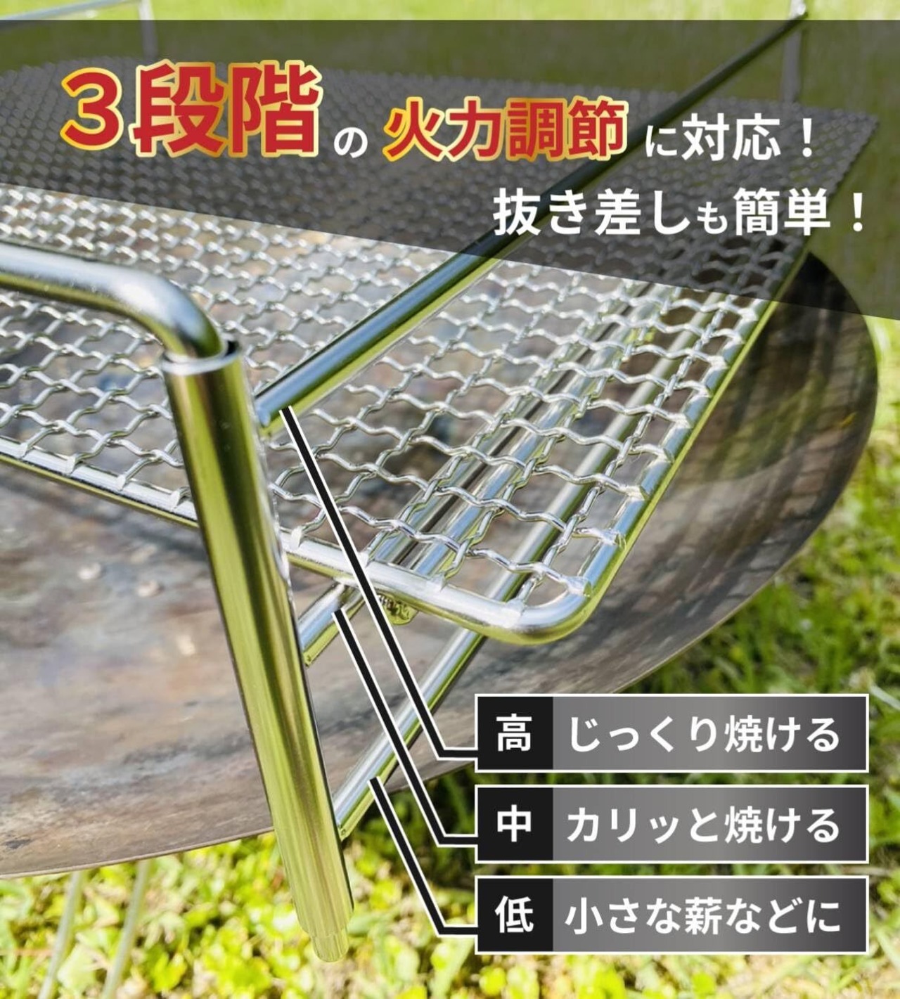 ■落下防止の動き止めの付いたステンレス専用焼き網もセットとなり、より焚火調理がしやすくなった商品です。