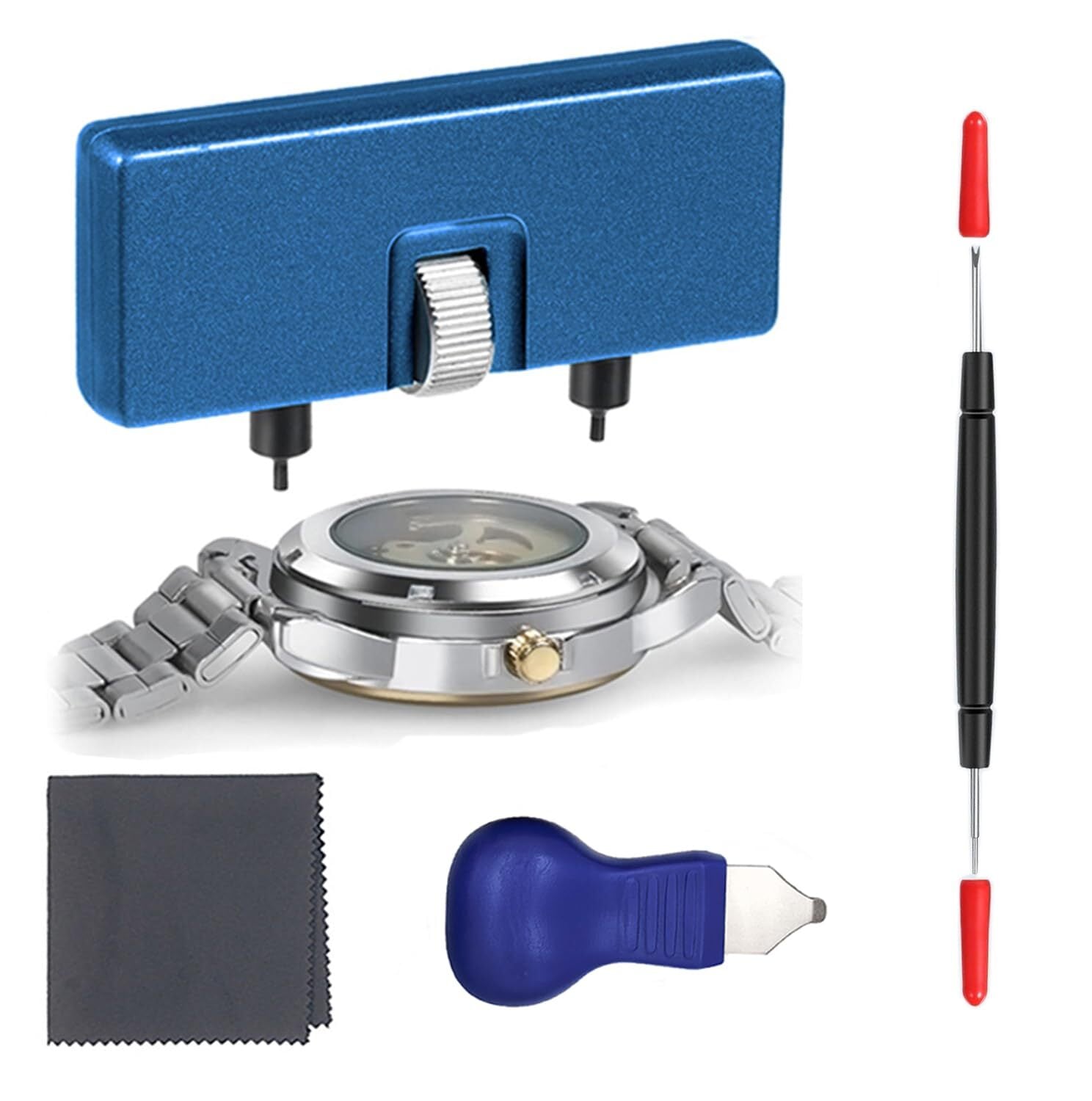【腕時計電池交換キット】 この腕時計裏蓋外しキットは、ケースオープナー、スプリング式ツール、クリーニングクロスで構成されています。時計の裏蓋を開ける、時計の電池を交換する、時計のストラップを交換するなど、様々な作業を行うのに役立ちます。