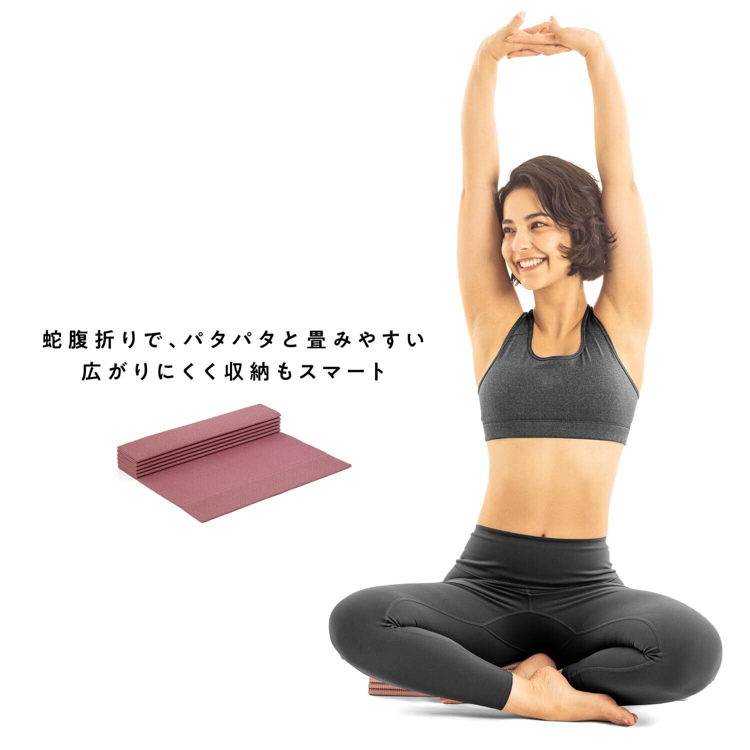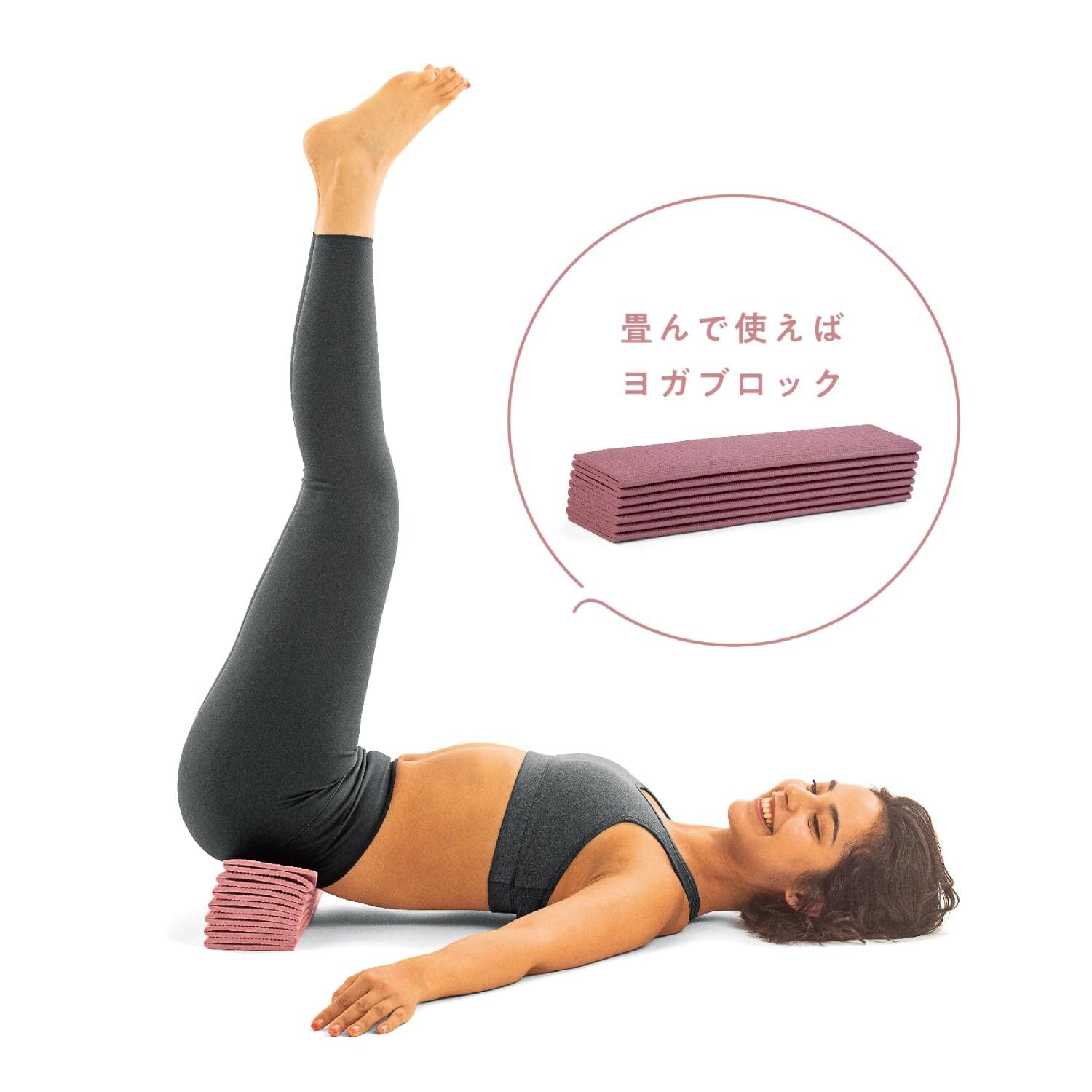 厚み6mmのクッション性が床の硬さをしっかり吸収しつつ、安定感も損なわないため、ヨガ初心者から経験者まで幅広く使いやすく、折りたたみ時にはヨガブロックとしても活用できる汎用性の高さがあります。